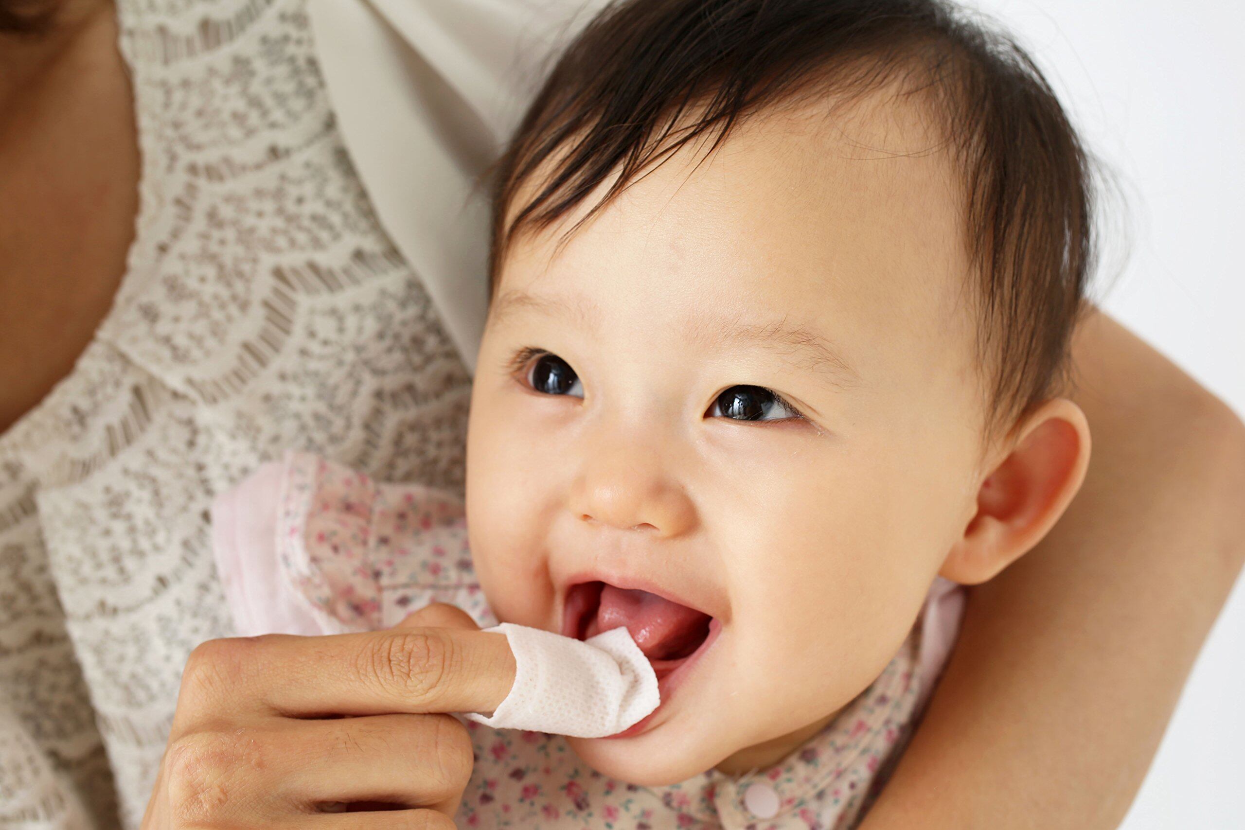 メッシュを濡らし、赤ちゃんの歯に当て、円を描くようにやさしくこすり、洗い流す