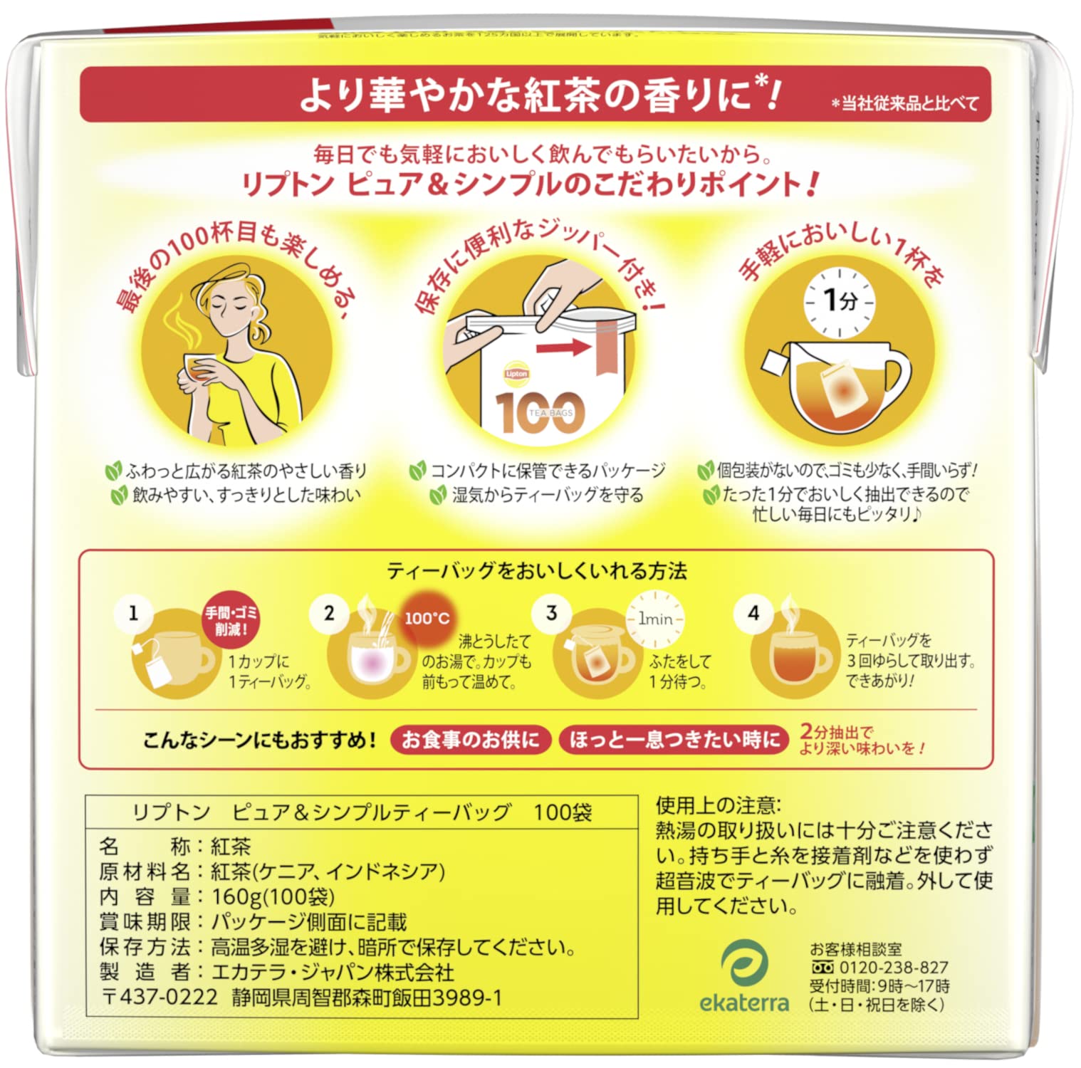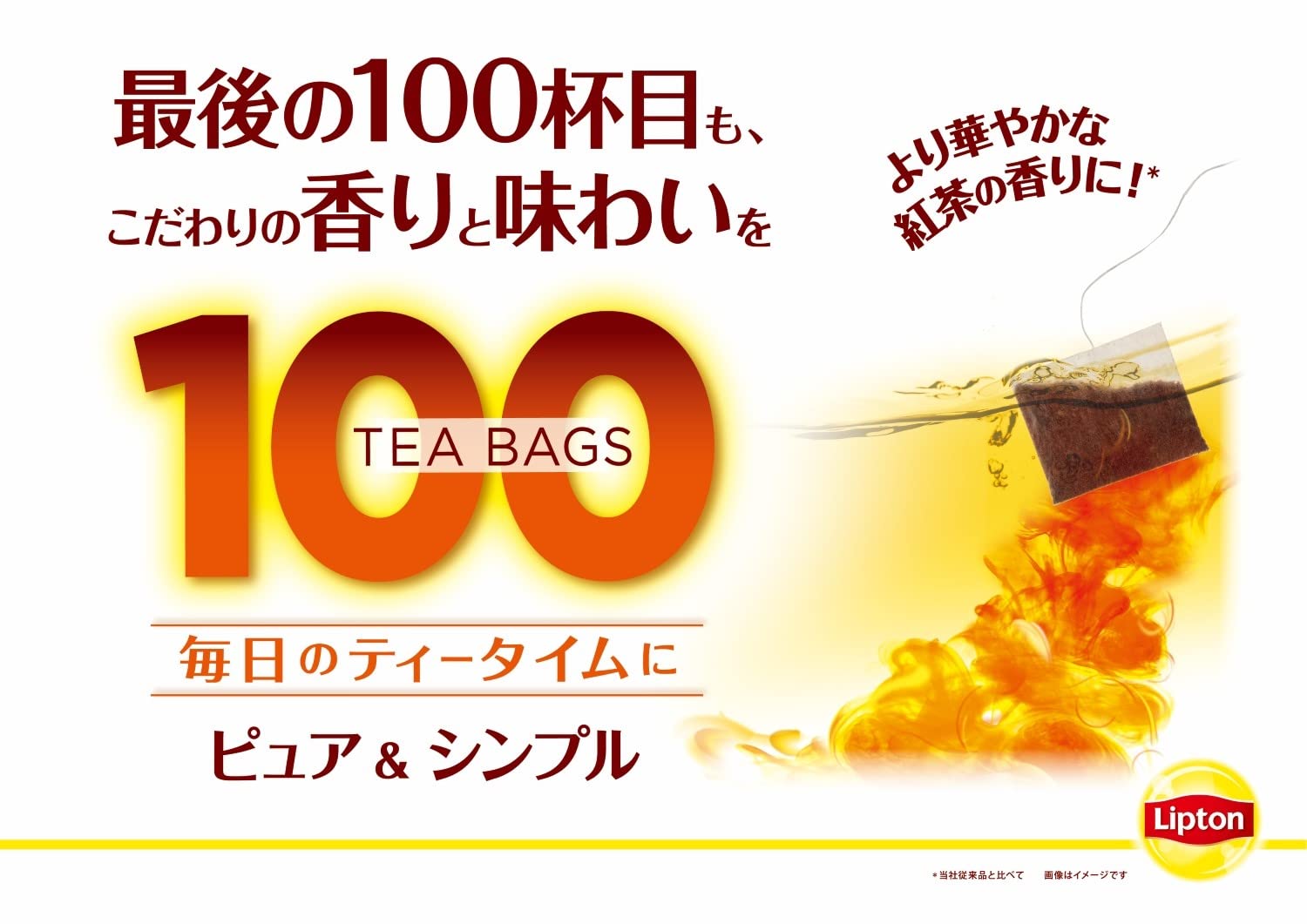 毎日の忙しい時間でも、気軽に美味しい紅茶をたっぷり飲める大容量100袋入り。 個包装がない分、厳選されたおいしい茶葉を使用。コンパクトで湿気から製品を守る、保存に便利なパッケージになりました。レインフォレストアライアンス認証取得茶葉100%使用。 1分抽出で、忙しい時にぴったり! すっきりとした味わい。2分抽出で、やすらぎのひと時により深い味わいを! ミルクを入れて飲むとおススメです。 使用方法 ティーバッグをおいしくいれる方法 11カップに1ティーバッグ。2沸とうしたてのお湯で。カップも前もって温めて。3ふたをして1分待つ。4ティーバッグを3回ゆらして取り出す。できあがり! おススメの飲み方 ゴクゴク飲みたいときに(忙しい日常の合間に):1分抽出で、忙しい時にぴったり! すっきりとした味わい。 じっくり味わいたいときに(やすらぎのひと時に):2分抽出で、やすらぎのひと時により深い味わいを! ミルクを入れて飲むとおススメです。