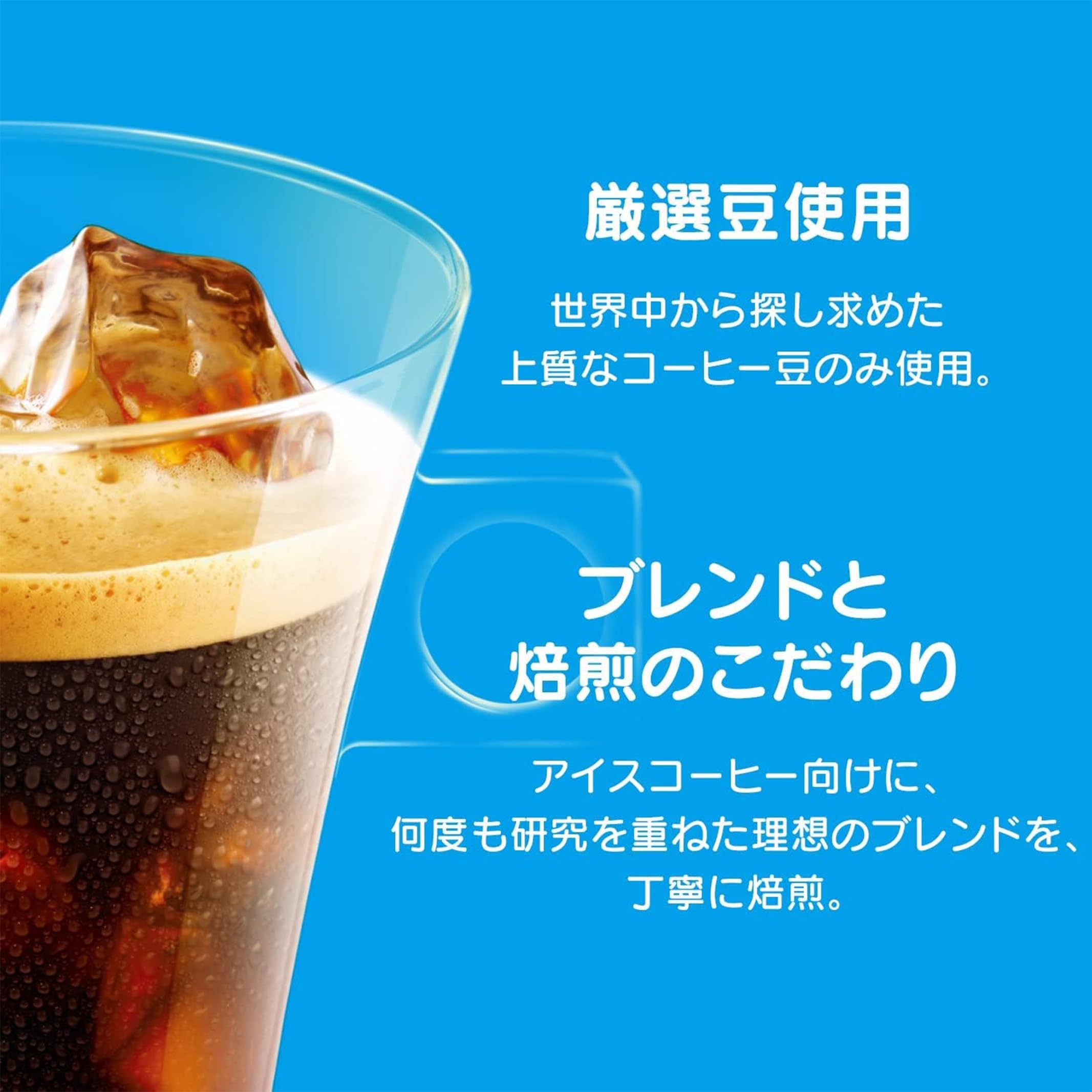 世界中から探し求めた上質なコーヒー豆のみを使用し、アイスコーヒー向けに何度も研究を重ねた理想のブレンドを、丁寧に焙煎しました。カフェで飲むようなアイスコーヒーの香り、香ばしさ、味わいが楽しめます。