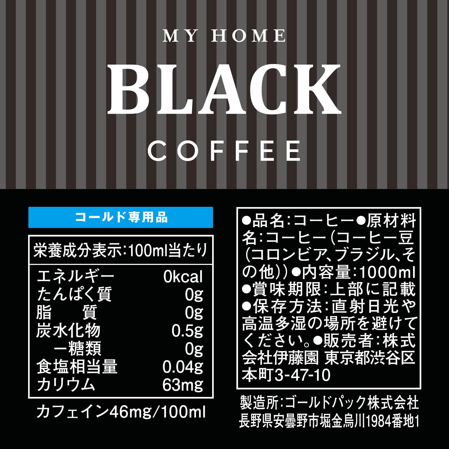 栄養成分(100ml当たり):エネルギー 0kcal、たんぱく質 0g、脂質 0g、炭水化物 0.5g (糖類 0g)、食塩相当量 0.04g、カリウム 63mg、カフェイン 46mg