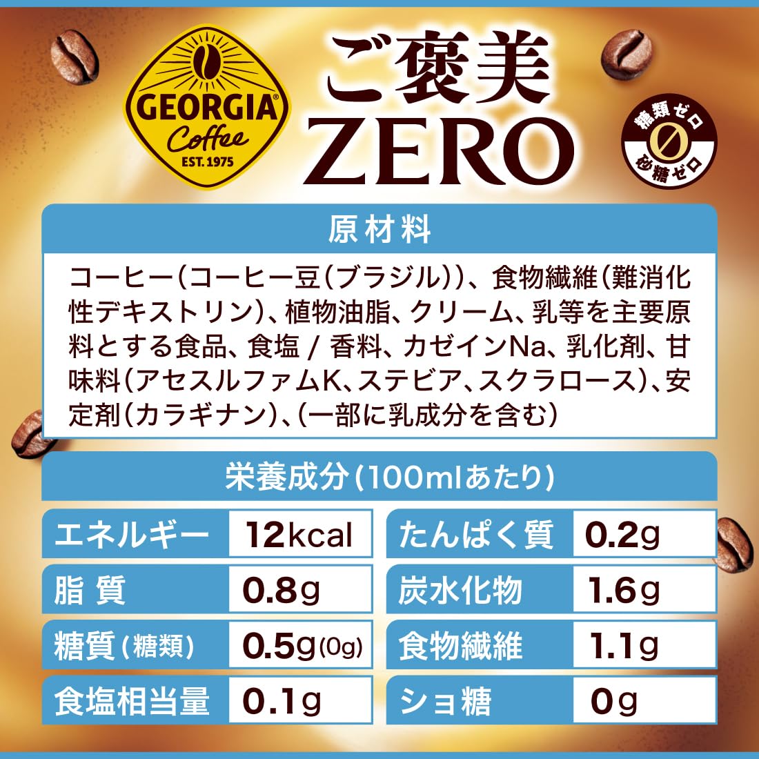 原材料:コーヒー(コーヒー豆(ブラジル))、食物繊維(難消化性デキストリン)、植物油脂、クリーム、乳等を主要原料とする食品、食塩/ 香料、カゼインNa、乳化剤、甘味料(アセスルファムK、ステビア、スクラロース)、安定剤(カラギナン)、(一部に乳成分を含む)