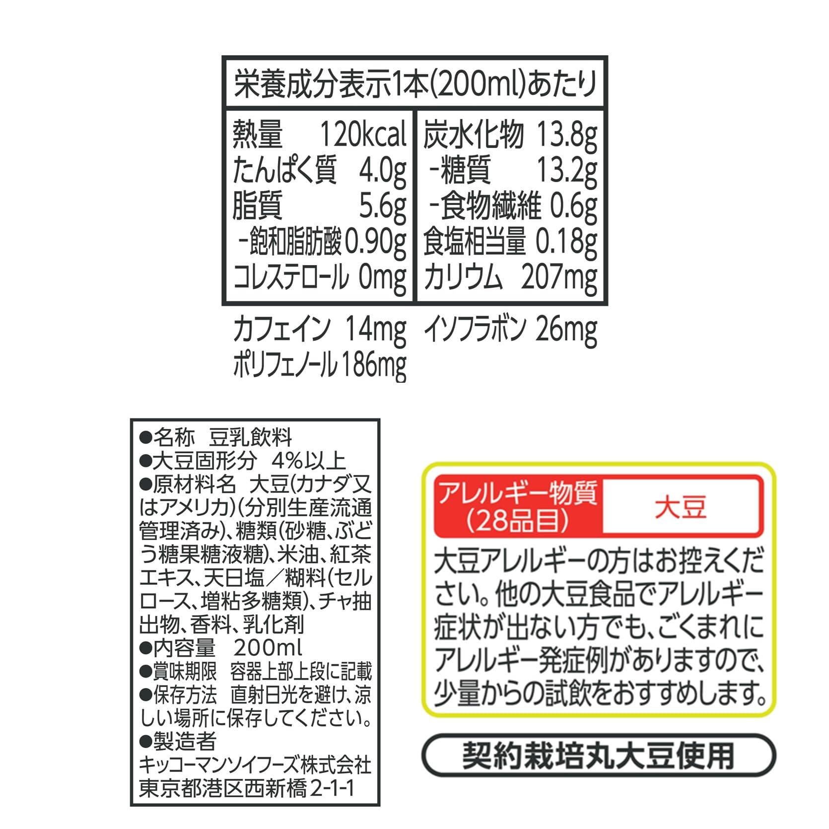原材料:大豆(カナダ又はアメリカ)(分別生産流通管理済み)、糖類(砂糖、ぶどう糖果糖液糖)、米油、紅茶エキス、天日塩/糊料(セルロース、増粘多糖類)、チャ抽出物、香料、乳化剤