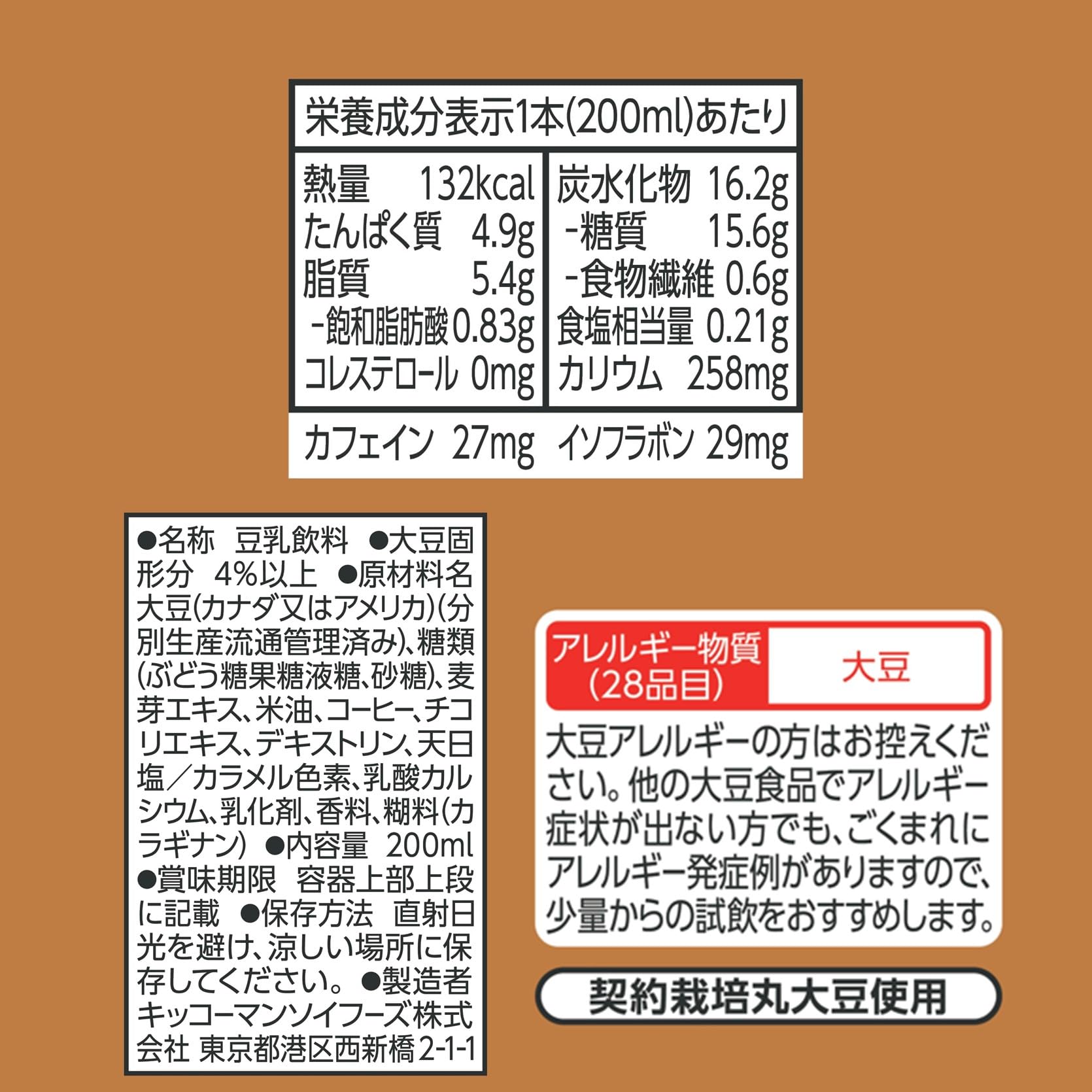 原材料:大豆(カナダ又はアメリカ)(分別生産流通管理済み)、糖類(ぶどう糖果糖液糖、砂糖)、麦芽エキス、米油、コーヒー、チコリエキス、デキストリン、天日塩/カラメル色素、乳酸カルシウム、乳化剤、香料、糊料(カラギナン)