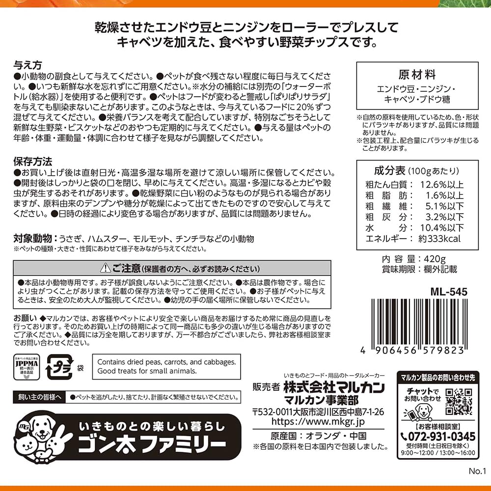 【給与方法】 ・小動物の副食として与えてください。 ・ペットが食べ残さない程度に毎日与えてください。 ・いつも新鮮な水を忘れずにご用意ください。 ※水分の補給には別売りのウォーターボトル(給水器)を使用すると便利です。 ・ペットはフードが変わると警戒し「ぱりぱり野菜」を与えても馴染まないことがあります。このようなときは、今与えているフードに20%ずつ混ぜて与えてください。 ・栄養バランスを考えて配合していますが、特別なごちそうとして新鮮な生野菜・ビスケットなどのおやつも定期的に与えてください。 ・与える量はペットの年齢・体重・運動量・体調に合わせて様子みながら調整してください。 【保管方法】 ・お買い上げ後は直射日光・高温多湿な場所を避けて涼しいところで保管してください。 ・開封後はしっかりと袋の口を閉じて、早めに与えてください。高温・多湿になるとカビや穀虫が発生するおそれがあります。 ・乾燥野菜に白い粉のようなものが見られる場合がありますが、原料由来のデンプンや糖分が乾燥によってできたものです。また、まれに野菜の「茎・枝」の部分が混入することがありますが無害です。安心して与えてください。 ・日時の経過により変色する場合がありますが、品質には問題ありません。 【対象動物】 うさぎ・ハムスター・モルモット・チンチラなどの小動物 ※ペットの種類・大きさ・性質にあわせて様子をみながら与えてください。 【諸注意】 ・本品は小動物専用です。お子様が誤食しないようにご注意ください。 ・本品は農作物です。場合により虫がつくことがあります。記載の保存方法を守ってご使用ください。 ・お子様がペットに与えるときは、安全のため大人が監視してください。 ・幼児の手の届く場所に保管しないでください。