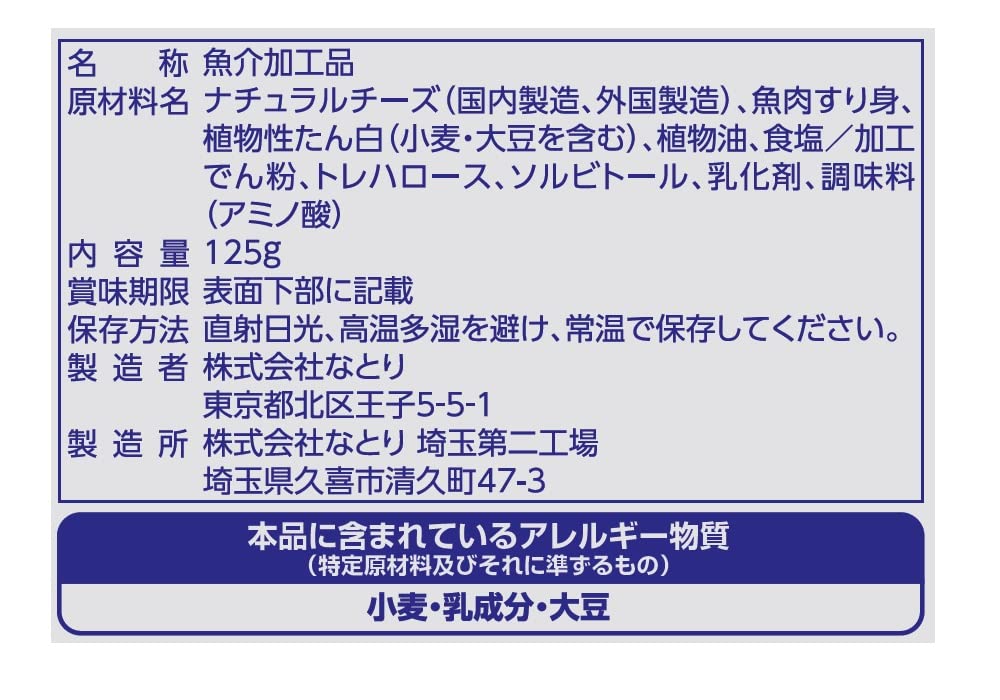 原材料:ナチュラルチーズ(国内製造・外国製造)、魚肉すり身、植物性たん白(小麦・大豆を含む)、植物油、食塩/加工でん粉、ソルビトール、乳化剤、調味料(アミノ酸)