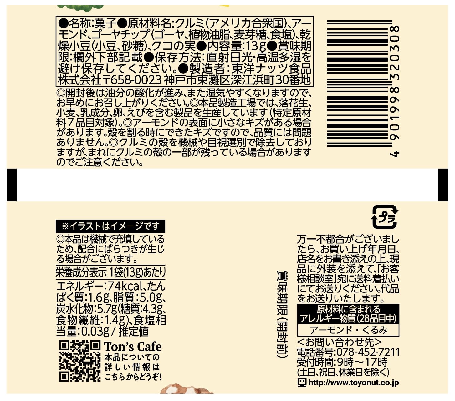 原材料:クルミ(アメリカ合衆国)、アーモンド、ゴーヤチップ(ゴーヤ、植物油脂、麦芽糖、食塩)、乾燥小豆(小豆、砂糖)、クコの実