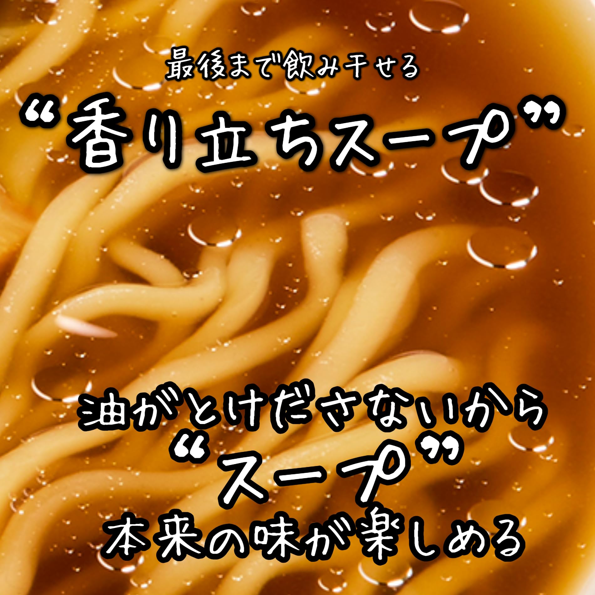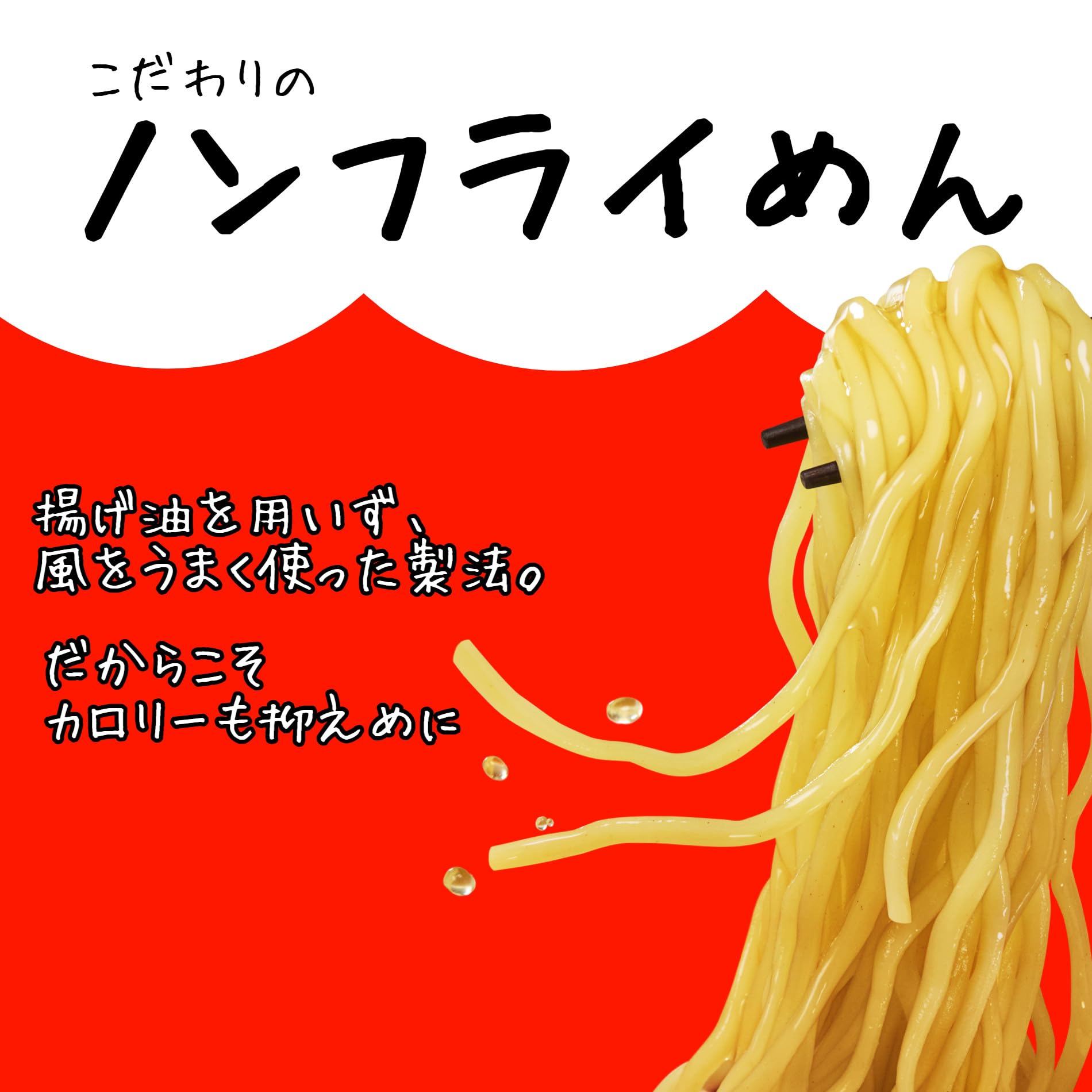 【鶏ガラ醤油】鶏ガラをベースに野菜や香辛料を加え、煮干・昆布の和風だしを合わせた、すっきりとした中にもコクのある香り高い醤油味【合わせ味噌】ポークエキスをベースにし、赤・白合わせ味噌を使用した、深みのあるコクの食欲そそる味噌味【旨コク豚骨】豚骨の旨みに、ガーリックとごま油風味を利かせた、コクのある豚骨味。