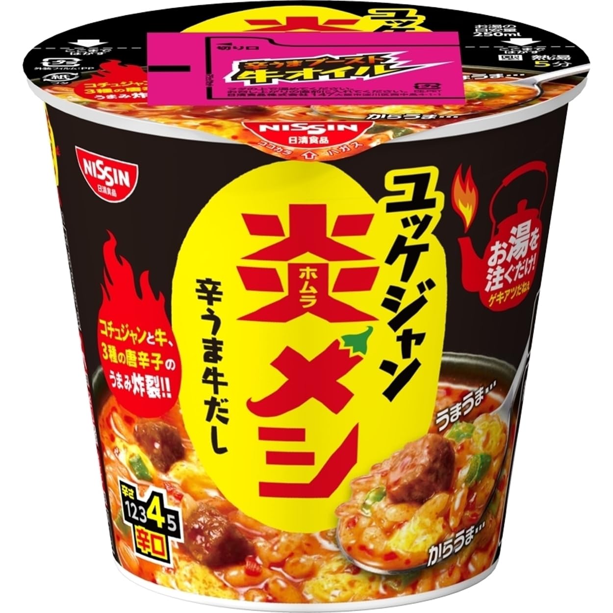 【1】フタの上の辛うまブースト牛オイルの袋を取り、フタを↓まではがす。【2】熱湯を内側の線までゆっくりと、まんべんなく注ぐ。【3】辛うまブースト牛オイルをフタの上で温めながら5分待つ。【4】フタをはがし、辛うまブースト牛オイルを入れ、よくかきまぜてできあがり。