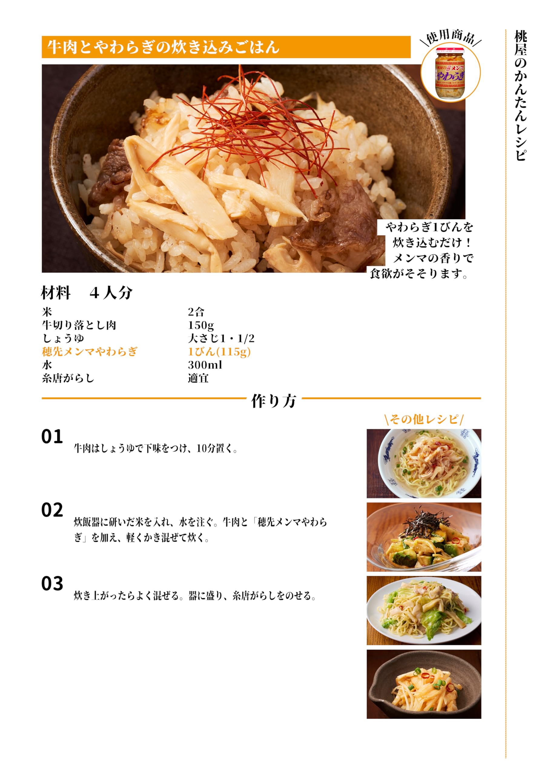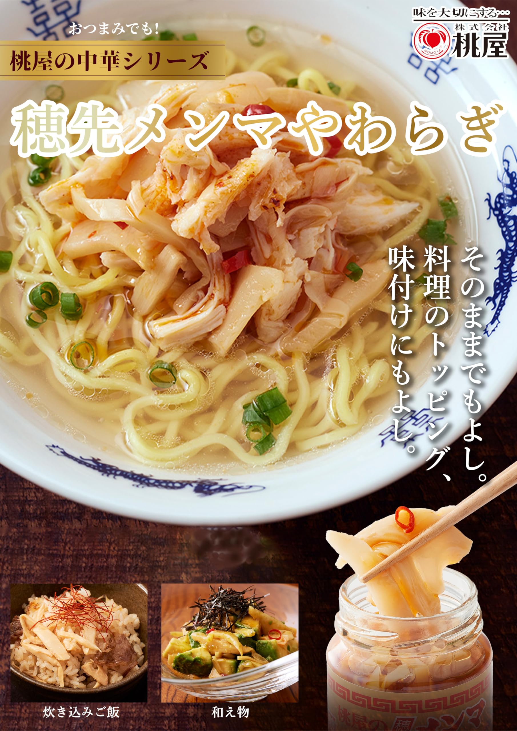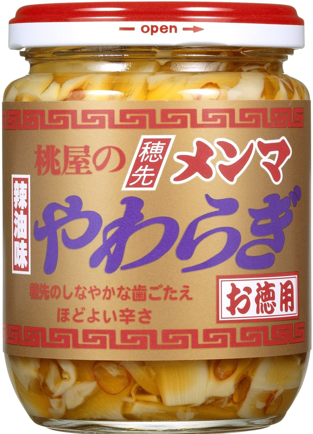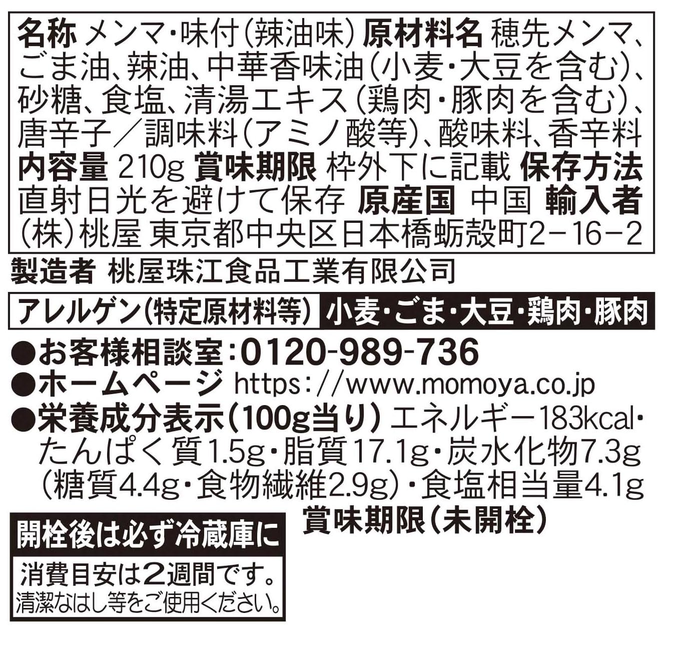 原材料:メンマ(穂先)、ごま油、辣油、砂糖、食塩、清湯エキス、唐辛子、調味料(アミノ酸等)、クエン酸(原材料の一部に小麦を含む)