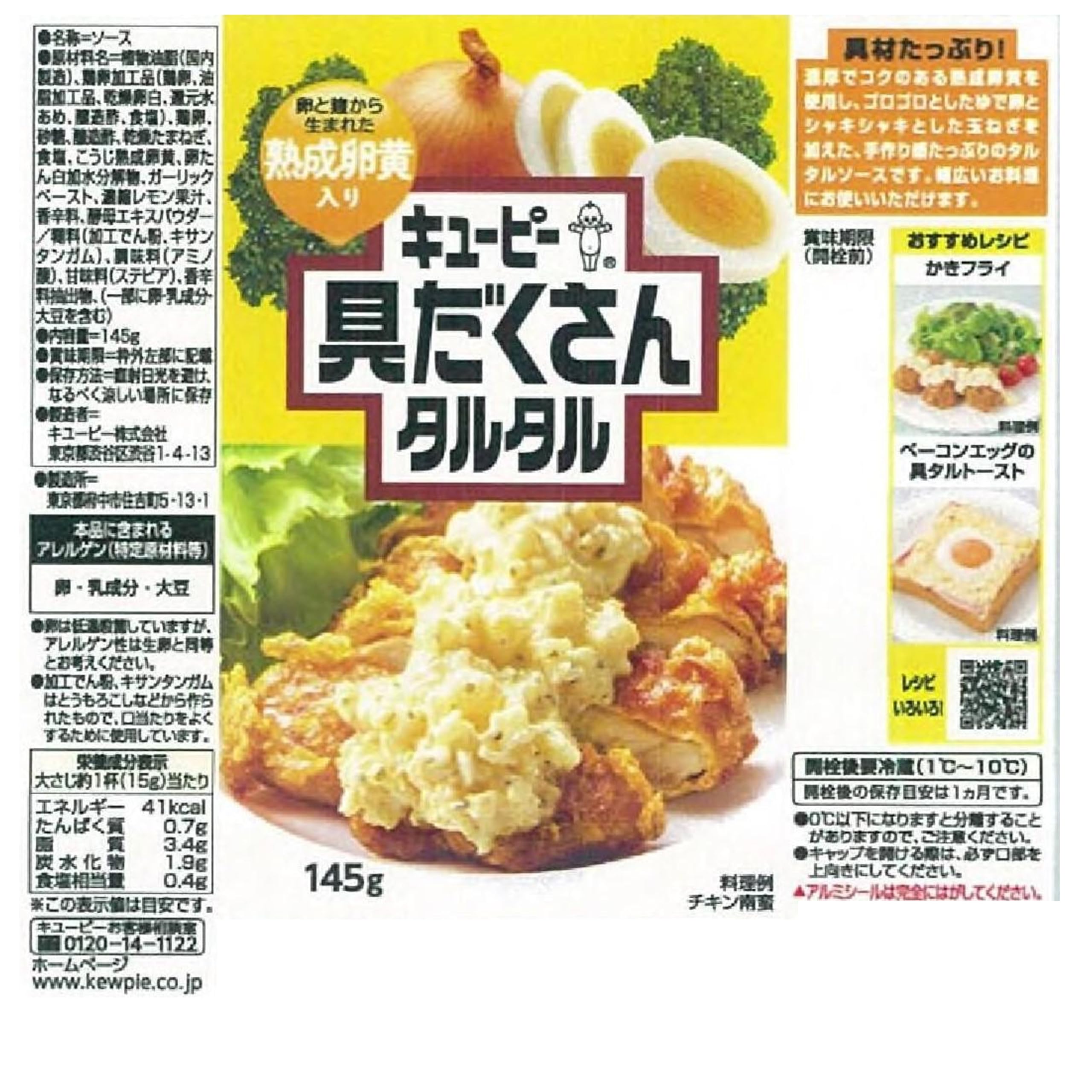 原材料:植物油脂(国内製造)、卵白加工品(卵白、油脂加工品、還元水あめ、醸造酢、食塩)、鶏卵、砂糖、醸造酢、乾燥たまねぎ、食塩、乳酸発酵卵白、鶏卵加工品、卵たん白加水分解物、ピクルス、ガーリックペースト、乳たん白、濃縮レモン果汁、香辛料/糊料(加工でん粉、キサンタンガム)、調味料(アミノ酸)、甘味料(ステビア)、香辛料抽出物、酸味料、(一部に卵・乳成分・大豆を含む)