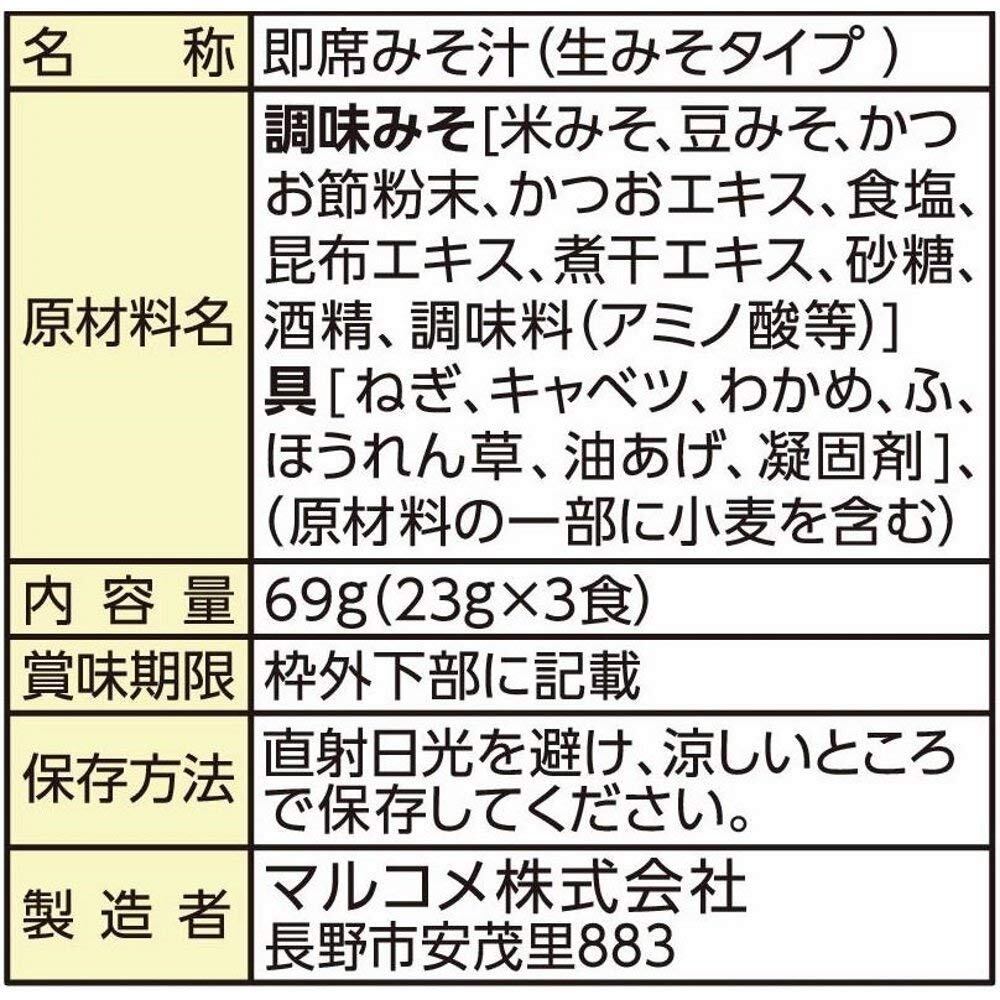 調味みそ[米みそ、豆みそ、かつお節粉末、かつおエキス、食塩、昆布エキス、煮干エキス、砂糖、酒精、調味料(アミノ酸等)]具[ねぎ、わかめ、ふ、キャベツ、ほうれん草、油あげ、ぶどう糖、麦芽糖、凝固剤]、(原材料の一部に小麦を含む)