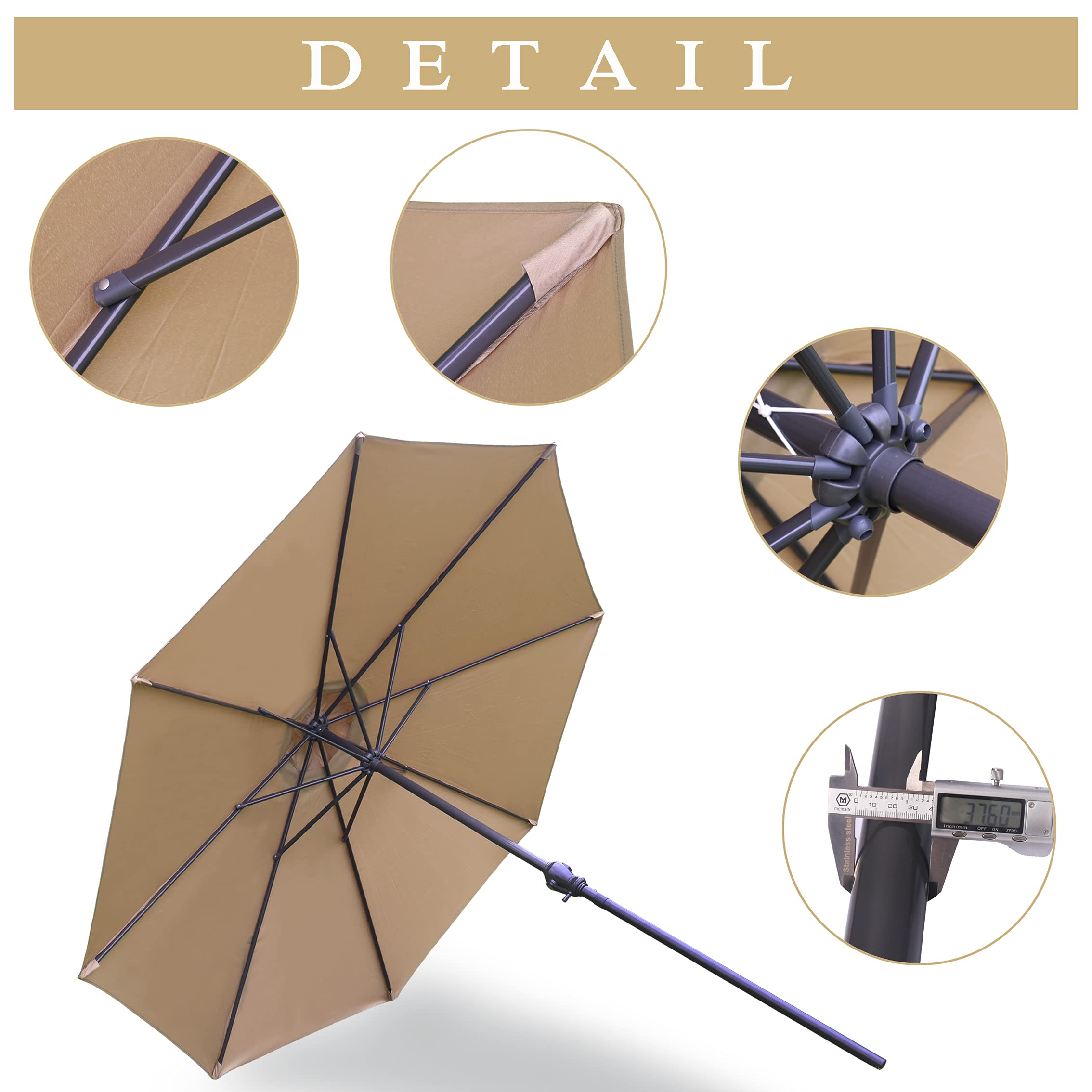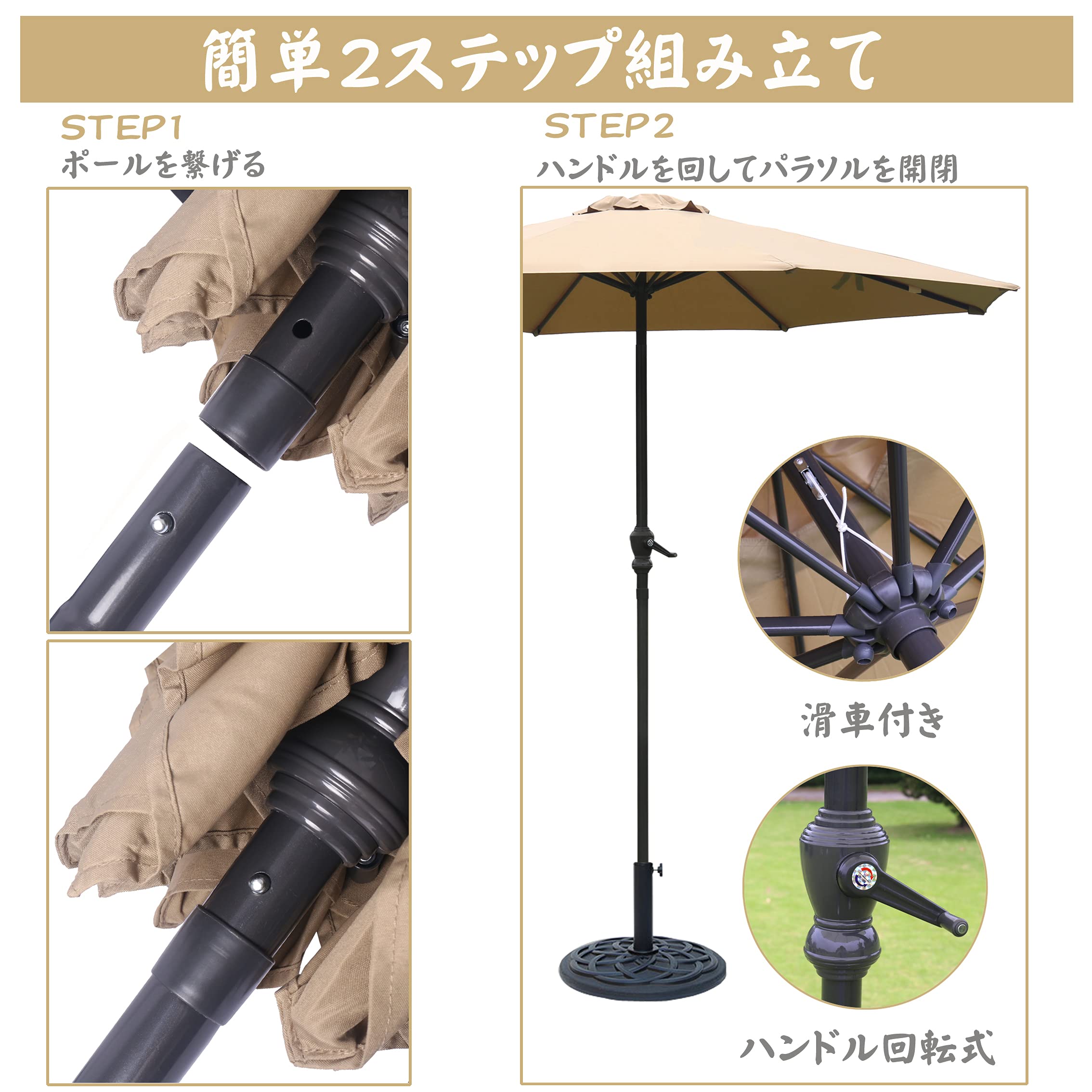 ハンドル回転式:パラソルの開閉には、普通の傘とは違いハンドル式を採用、クルクルと回すだけで開閉できるので、これほど大きなパラソルでも女性一人で簡単に開閉できます