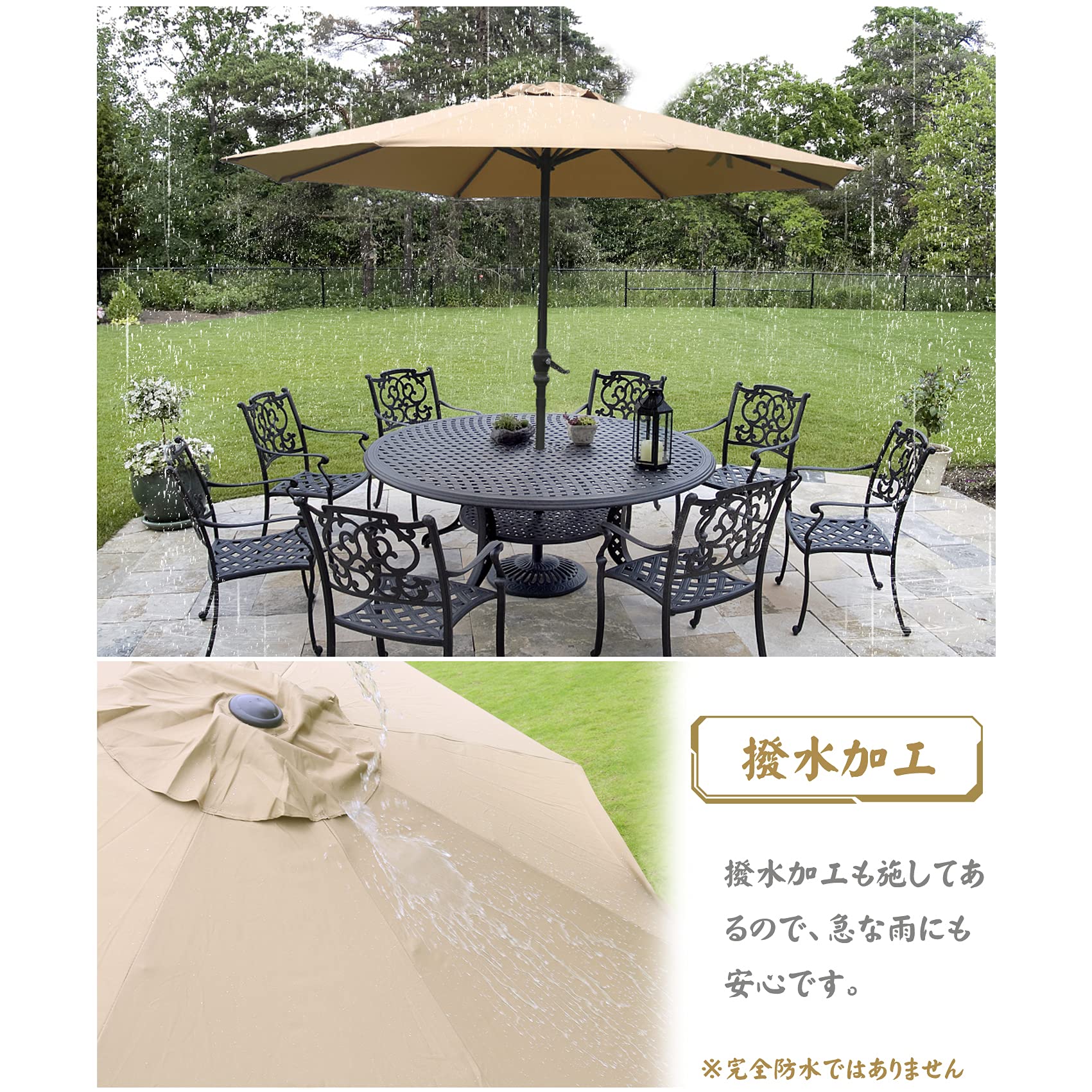 撥水加工:ガーデンパラソルは水や汚れに強い撥水加工、雨に濡れても水を弾くので、雨漏れする心配はありません!お手入れもサッと拭くだけで簡単