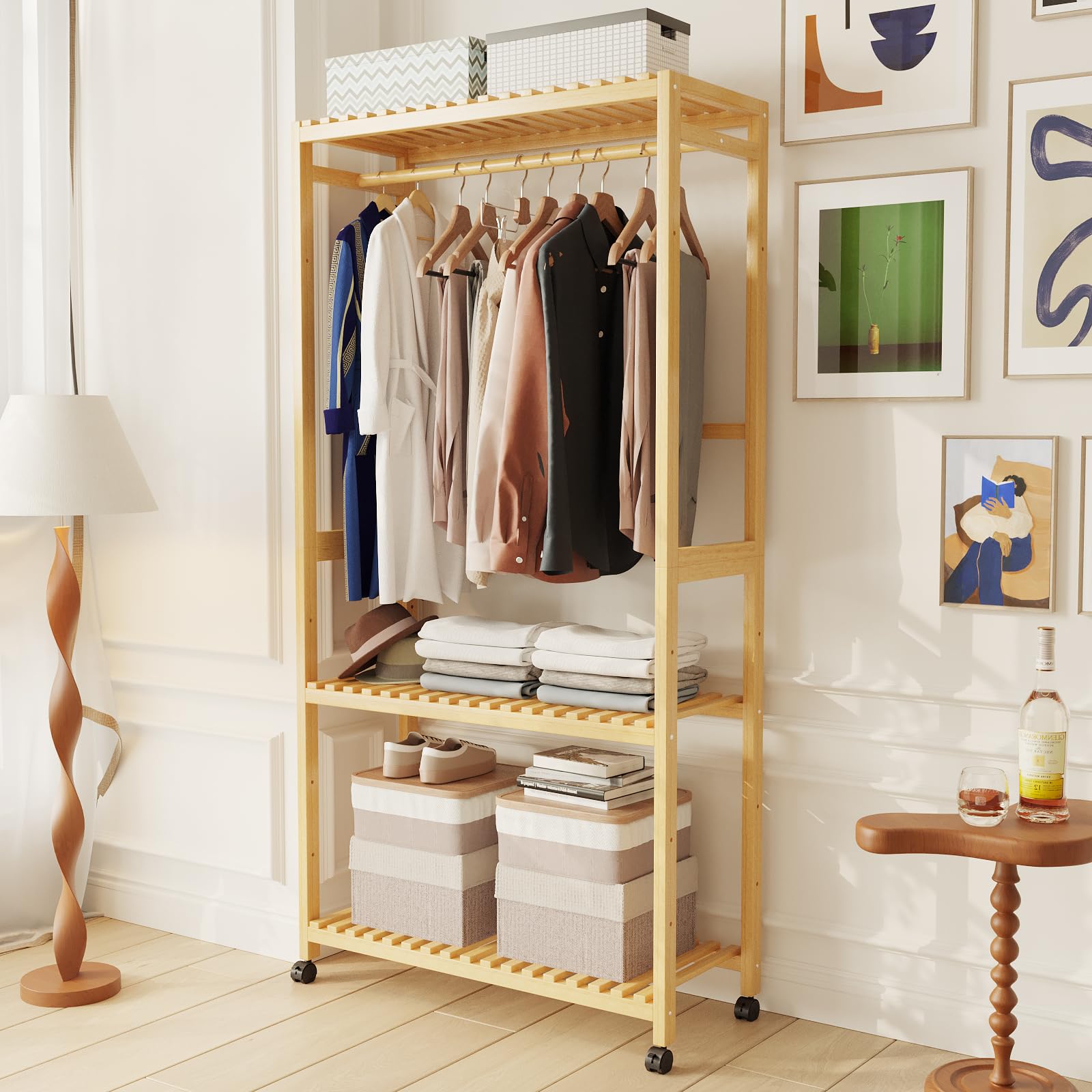 YASICA ハンガーラック コートハンガー キャスター付き 竹製 3段棚付き 棚の高さ調節可能 スリム コートハンガー 洋服ラック 洋服掛け 物干しラック 上部収納 大きな吊り下げスペース ポールハンガー ワードローブ 耐荷重100kg 省スペース 組立簡単 寝室/玄関/家庭用(原木色 83×34×164cm)