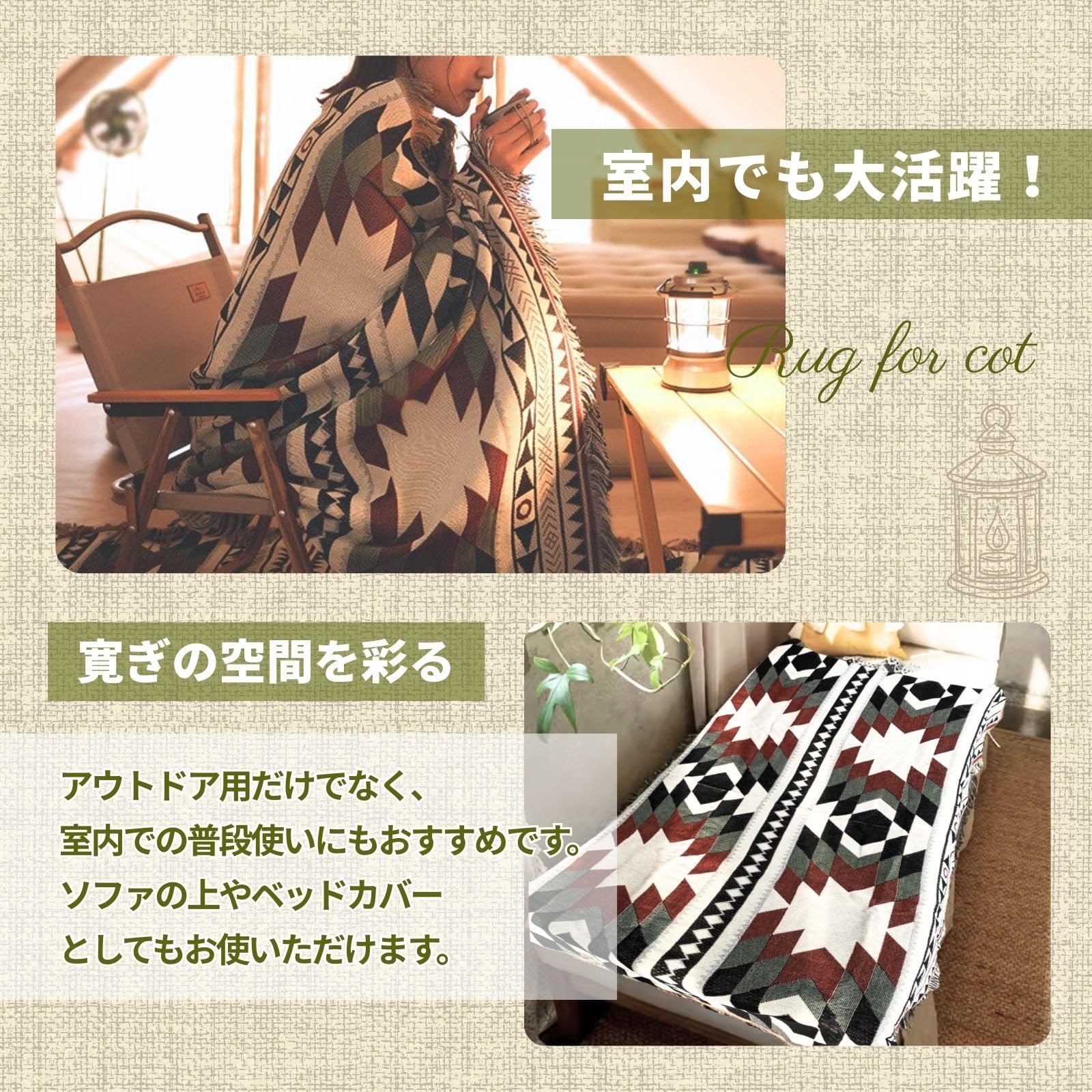 【室内でも大活躍】アウトドア用だけでなく、室内での普段使いにもおすすめです。ソファの上やフロアーマットとしてもお使いただけます。1枚広げるだけでぐっと雰囲気を盛り上げ、寛ぎの空間を彩ります。