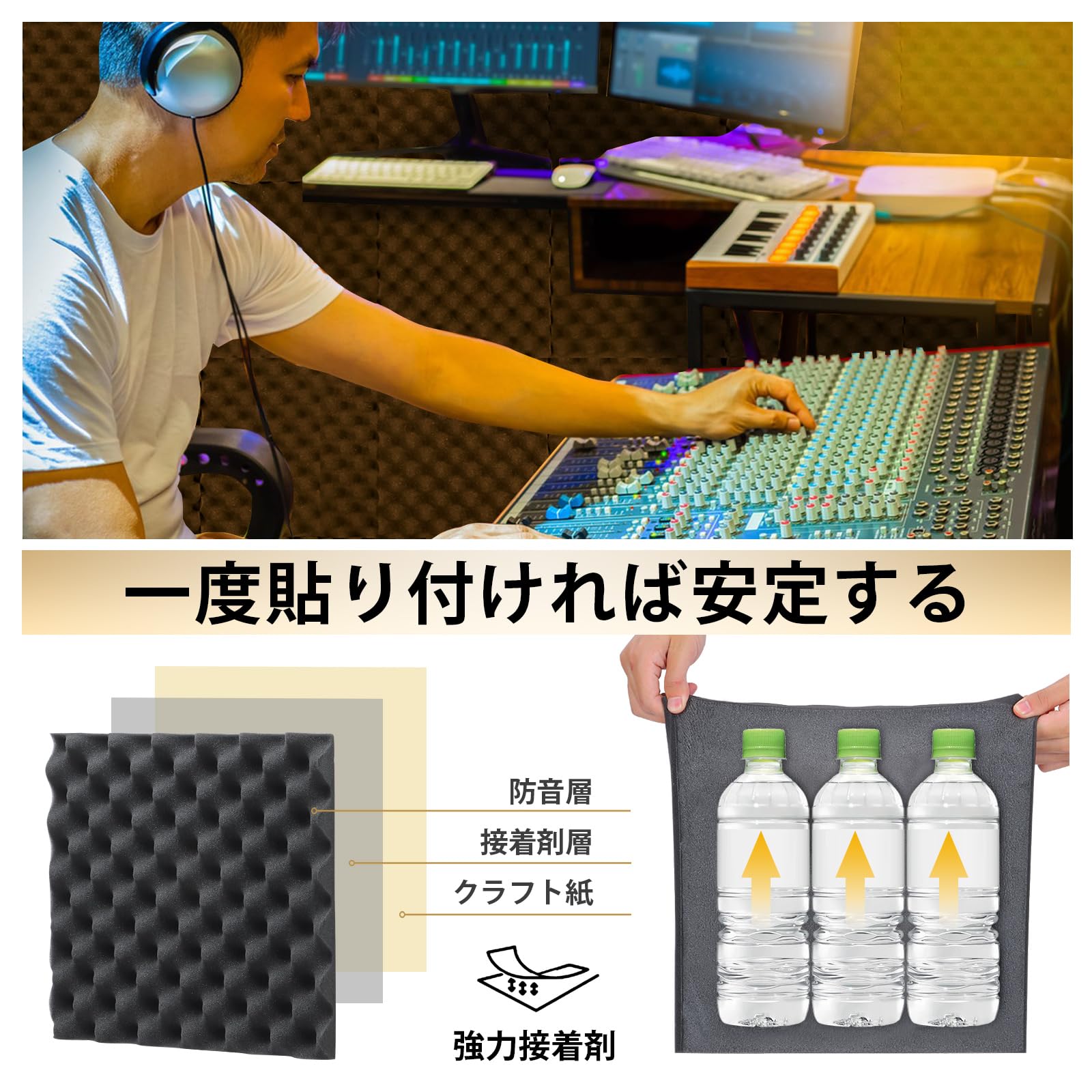 【取り付けが簡単】- 設置が難しいという問題を解決するために、私たちは強力な接着剤で裏打ちされた防音シートをアップグレードしました。防音パネル裏面のクラフト紙をはがし、お好みの位置に固定するだけです。自己粘着性のデザインなので、余分なテープを用意する必要はなく、設置場所が清潔で乾いていることを確認するだけでよい。