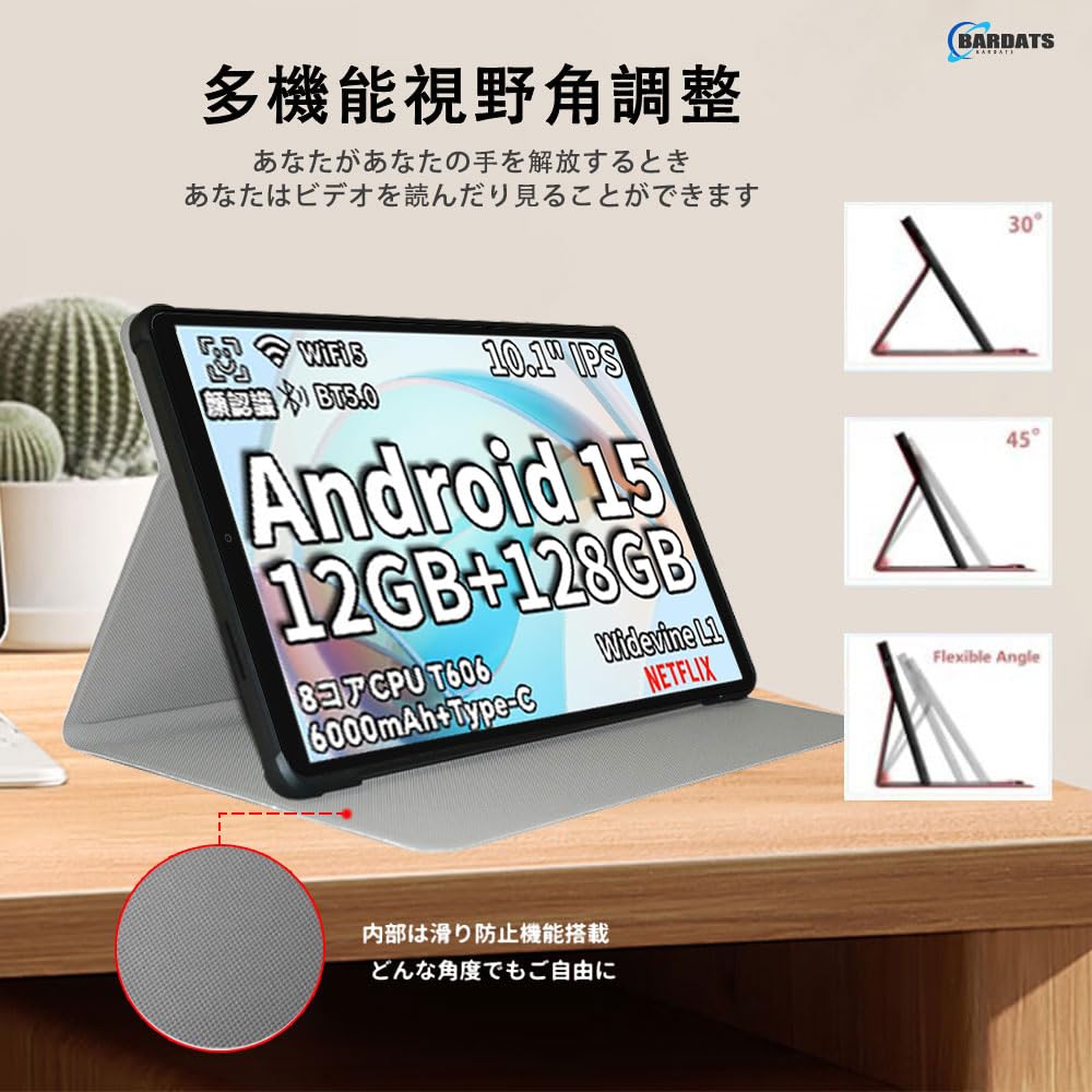 【スタンド機能】スタンド機能がありますので、タブレットを立てかけて、お好きな角度でご利用でき、特に動画視聴や仕事などにとても便利です。スタンド機能で長時間の視聴もお楽しみできます。
