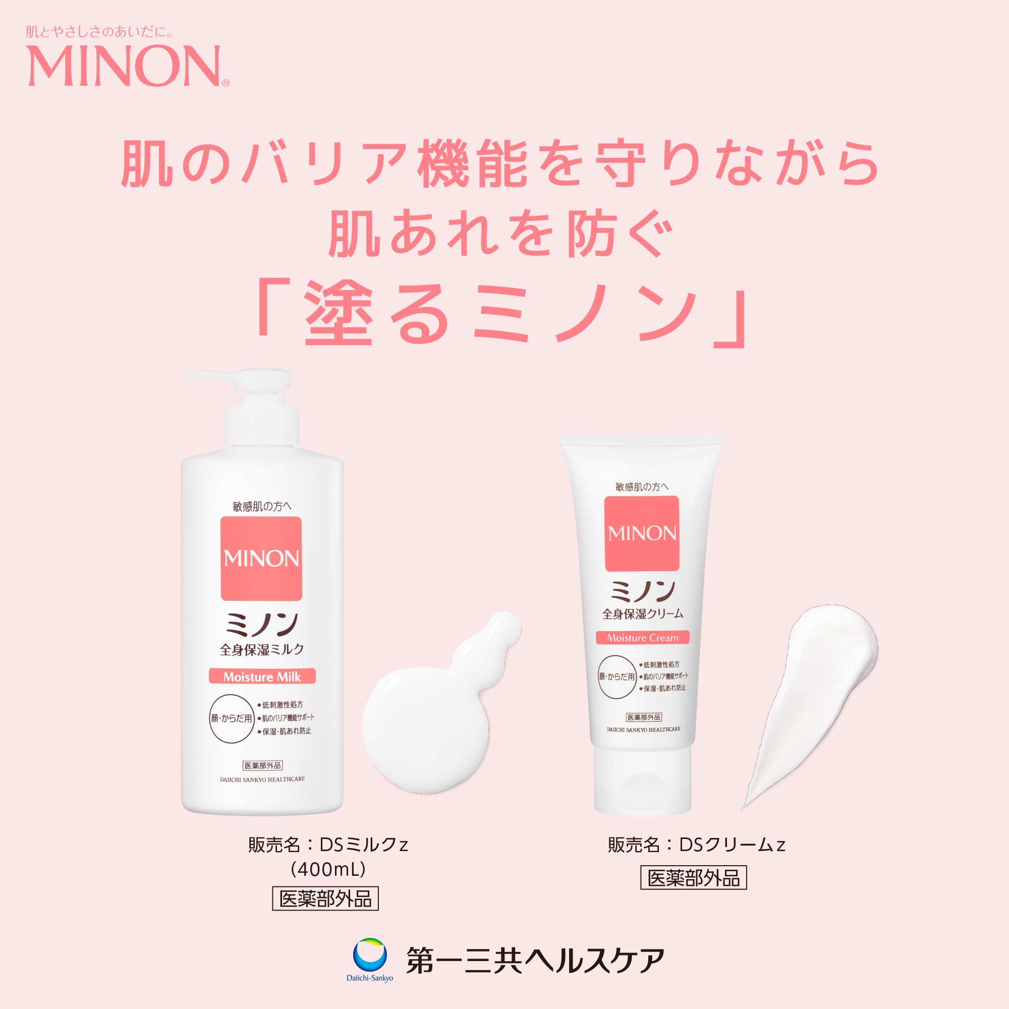 ミノン全身保湿ミルクは肌のバリア機能を守りながらうるおいを与える独自処方。とろけるように伸び、広い範囲の乾燥ケアにぴったりの全身保湿用のミルクです。ベタつかない使用感がお好みの方におすすめです。使いやすい大容量ポンプタイプ
