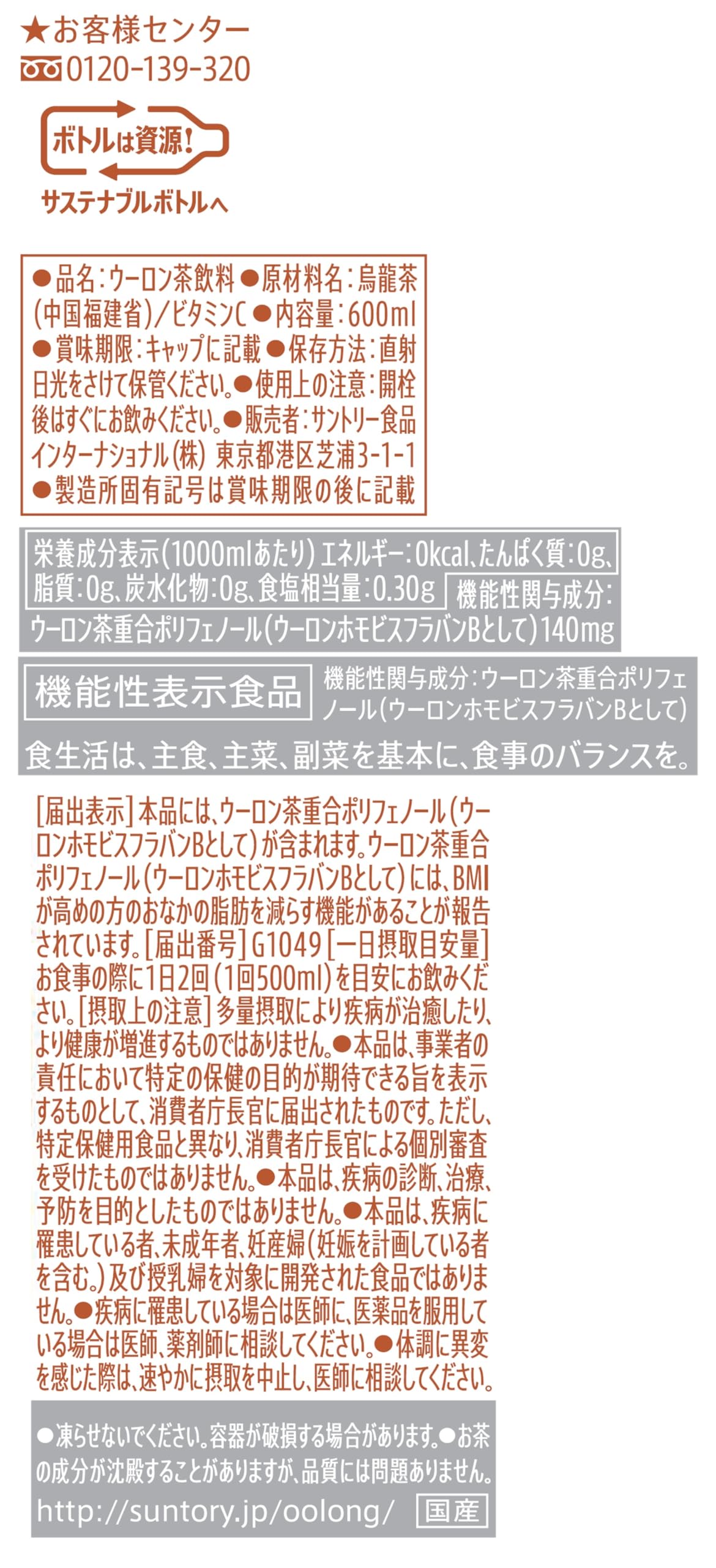 本品には、ウーロン茶重合ポリフェノール(ウーロンホモビスフラバンBとして)が含まれます。 ウーロン茶重合ポリフェノール(ウーロンホモビスフラバンBとして)には、BMIが高めの方のおなかの脂肪を減らす機能があることが報告されています。 【一日摂取目安量】お食事の際に1日2回(1回500ml)を目安にお飲みください。 【摂取上の注意】多量摂取により疾病が治癒したり、より健康が増進するものではありません。 [機能性表示食品] サントリー 烏龍茶 ラベルレス お茶 ペットボトル 525ml×24本は、コクがあるのにすっきり美味しい烏龍茶です。すっきりした味わいの秘密は、豊富に含まれている「ウーロン茶ポリフェノール」にあります。サントリー烏龍茶では、福建省北部にある武夷山(ぶいさん)やその周辺で育つ茶葉を使用していますが、この地域で育つウーロン茶は、半発酵のウーロン茶の中において、比較的発酵度が高いという特長があります。そのため、健康成分である「ウーロン茶ポリフェノール」がたくさん含まれており、飲み続けても渋みが残らない味わいを実現しました。しっかりとしたコクとキレのある味わい、お口さっぱりサントリー烏龍茶をお楽しみください。 ●烏龍茶本来のコク・濃さはそのままに、後口がよりすっきりした味わい ●茶葉抽出技術により、烏龍茶ならではのコク・香りは感じつつも、飲み続けても渋みが残らない設計 ●ペットボトル 500ml 525ml 550ml 600ml 680ml 700mlの容器体をお探しの方に ●茶 お茶 緑茶 ほうじ茶 ジャスミン茶 濃茶 濃い茶 濃い味 玄米茶 烏龍茶 紅茶 無糖茶などをお探しの方に ●水 ミネラルウォーター 天然水や炭酸水の代わりに、無糖のお茶を飲んでホッと一息 ●無糖飲料のため、毎日のお食事 お弁当 会議 通勤時のお供に ●機能性表示食品 おいしく、おなかの脂肪を減らす ダイエット 減量 ボディメイクのお供に 【ブランド紹介】サントリー烏龍茶は、1981年に缶入り烏龍茶として発売して以来40年以上もの間、多くのお客様から日々の水分補給として、また食事のお供としてご好評いただいているロングセラーブランドです。