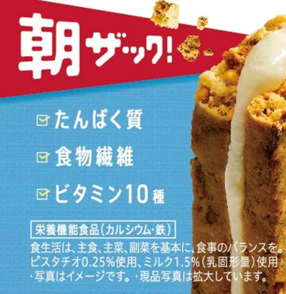●10素材(6種のシリアル:2種のブラン、小麦パフ、オートミール、玄米フレーク、大豆パフ・4種のナッツ:アーモンド、くるみ、カシューナッツ、ピスタチオ)を練り込んだ厚焼き生地にミルククリームをサンドしました。●くちどけのよいサクサク感と素材のザクザク感が融合した連食性の高い食感を実現し、パッケージでは“朝ザック!”という言葉で表現。●クリーム玄米ブランシリーズの中で最もボリュームのある“1個当たり25g”の大型サイズで、食事シーンでも満足できる食べ応えのある設計。●『10素材』を配合した商品であることを分かりやすく伝えるデザイン。●生地の中に練り込んでいる素材や食感、生地の厚み(ボリューム感)、クリームの味わいを伝えるこだわりの新シズル。●こだわりの“サクザック食感”を伝えるため、シズル画像でサクッとした食感を表現し、「朝ザック!」アイコンを生地近くに配置しました。