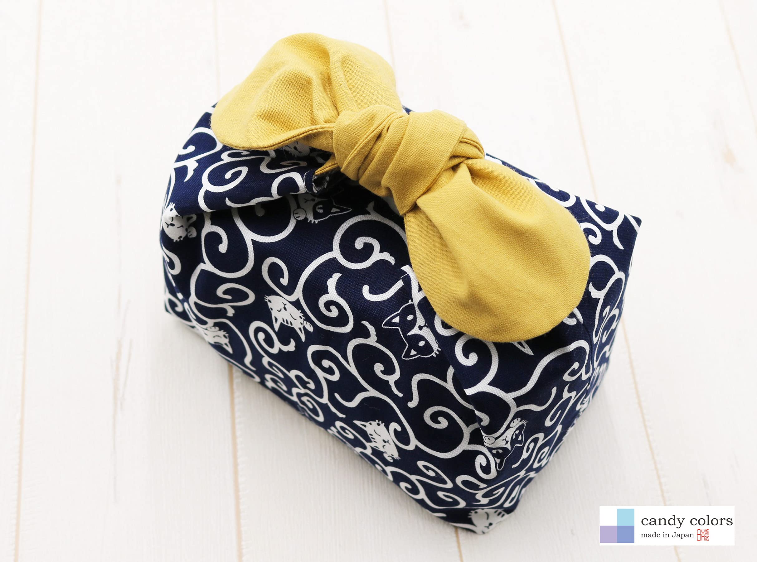 【在庫セール】お弁当袋 保冷保温 ランチバッグ 紐なし 結ぶタイプ あづま袋 リボン 和柄 (ネコ唐草 紺)