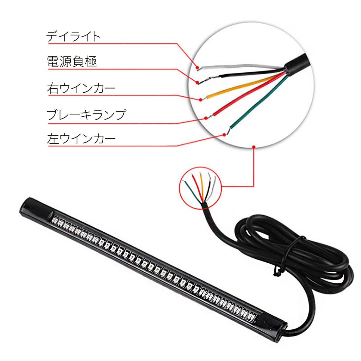 【製品パラメータ】本体サイズ(1枚):20.5*1.3*0.8cm /電源ケーブルの長さ:約20cm/本体重量(1枚):35g / 電圧:DC 12-15V/防水性能:IP68/簡単取り付け:3Mテープ、5線接続で取り付けます。