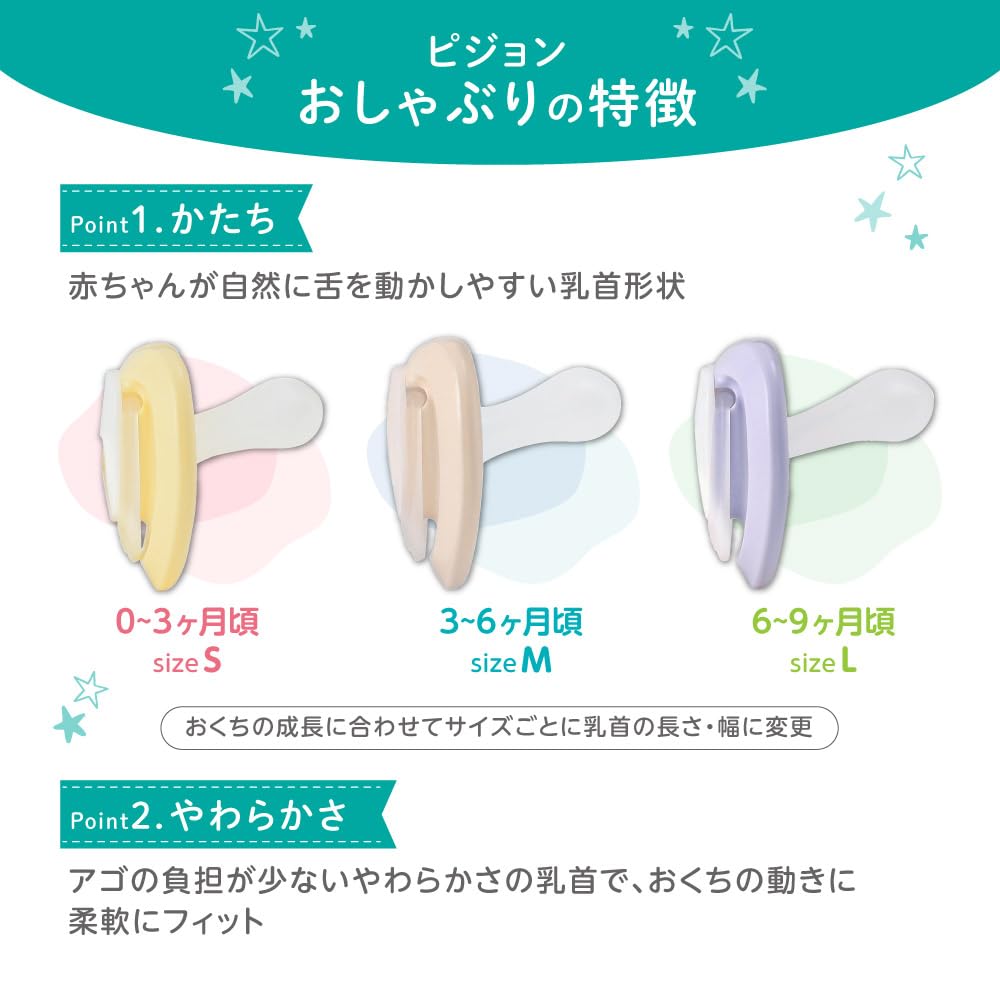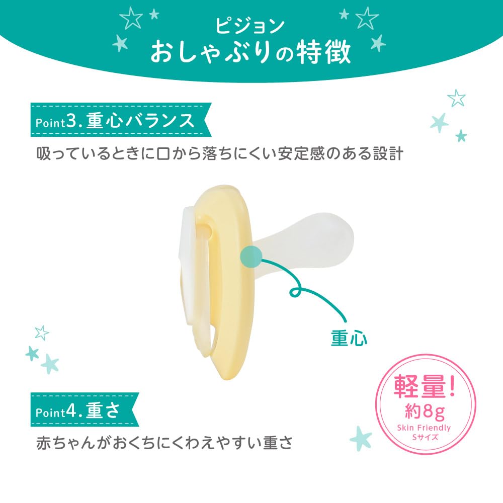 独自設計で、肌にやさしく通気性のよい形のSkinFriendlyシリーズ♪ ・肌にやさしい 座板に段差を設ける工夫で肌に触れる面を最小限に。 ・通気性 大きな通気穴で、ムレにくく、通気性がアップ! よだれかぶれになりにくい。 ■ピジョンのおしゃぶりの特徴 ・歯の発育を考えた小児歯科医監修のおしゃぶりです。(監修:小児歯科医 井上美津子先生) ・赤ちゃんの口腔研究に基づいて開発された上手に吸えて、落ち着き効果の高いおしゃぶりです。 ・ピジョンおしゃぶりは独自設計の4つのポイントに着目し、「吸いやすさ」を実現しています! ※4つのポイント 1かたち 赤ちゃんが自然に舌を動かしやすい乳首形状 おくちの成長に合わせてサイズを選べます。(3サイズ展開) 2重心バランス 吸っているときに口から落ちにくい安定感のある設計 3やわらかさ アゴの負担が少ないやわらか乳首で、おくちの動きに柔軟にフィット 4重さ 赤ちゃんがおくちに加えやすい重さ 【注意】 ●初めてお使いになる前に、また、普段のご使用後に必ず洗浄・消毒をしてください。 ●必ず保護者の目の届く範囲でご使用ください。赤ちゃんは思わぬ行動をすることがあります。 ●歯で噛んだり、長時間お使いになると乳首にキズがついたり切れるこ とがあります。ご使用の度に保護者の方が乳首を引っ張ってキズなどの異常がない か必ず確認してください。安全と衛生のため、1~2ヵ月使用したら、新しいおしゃぶ りに交換してください。 ●洗浄したときに、乳首内に水が入ることがあります。カビが 生える恐れがありますので、水が入った場合は乳首を指で押し、水を切ってお使いく ださい。 ●赤ちゃんが寝入ったら、おしゃぶりをはずしてください。下げたり、おしゃぶりホルダーとしてリボンやひもは使用しな いでください。 ●長時間、直射日光があたる場所や火のそばに置かないでください。