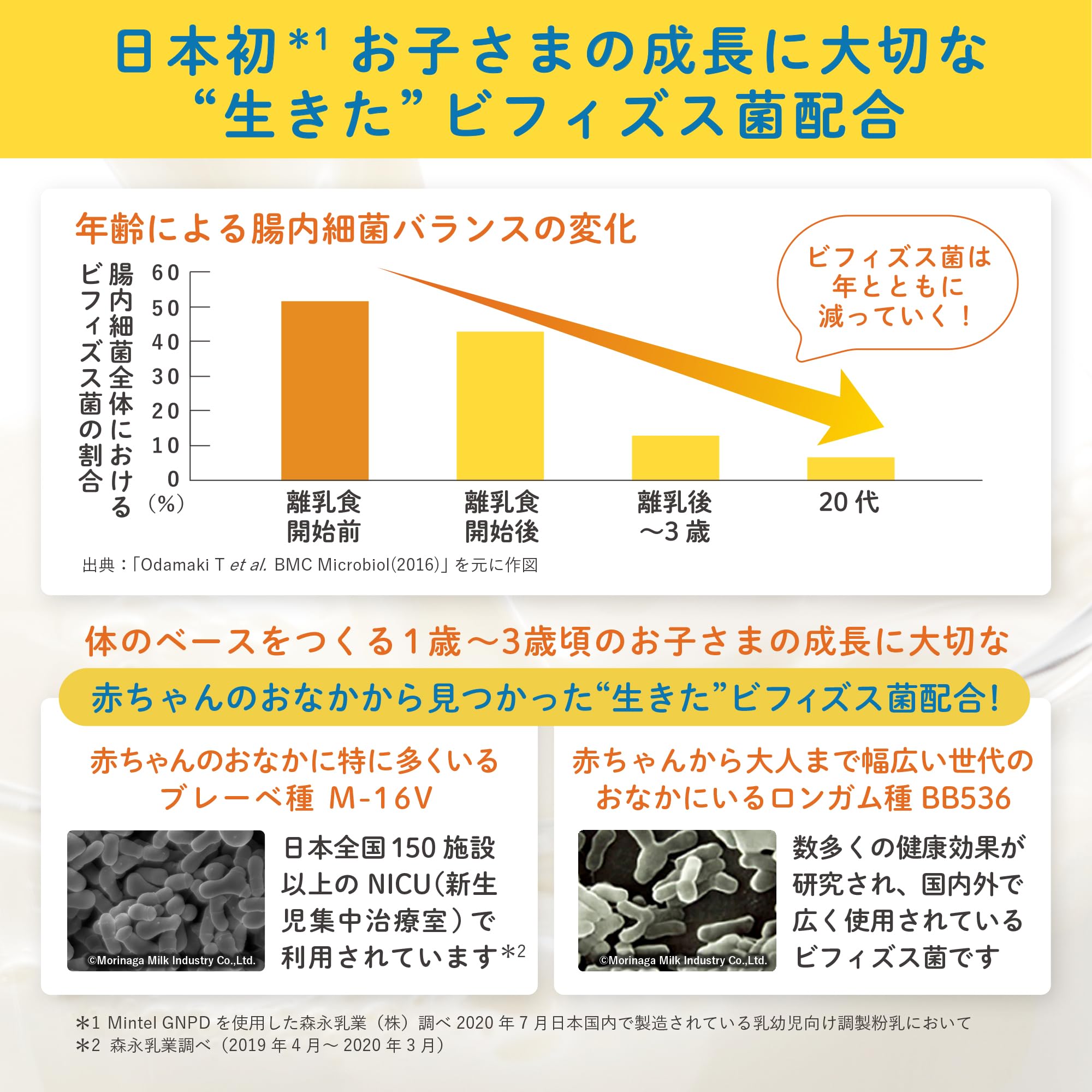 【ビフィズス菌配合】2種類のビフィズス菌(BB536・M-16V)を配合。ビフィズス菌M-16Vは全国150施設以上のNICU(新生児集中治療室)での使用実績があります。※森永乳業調べ(2019年4月~2020年3月)
