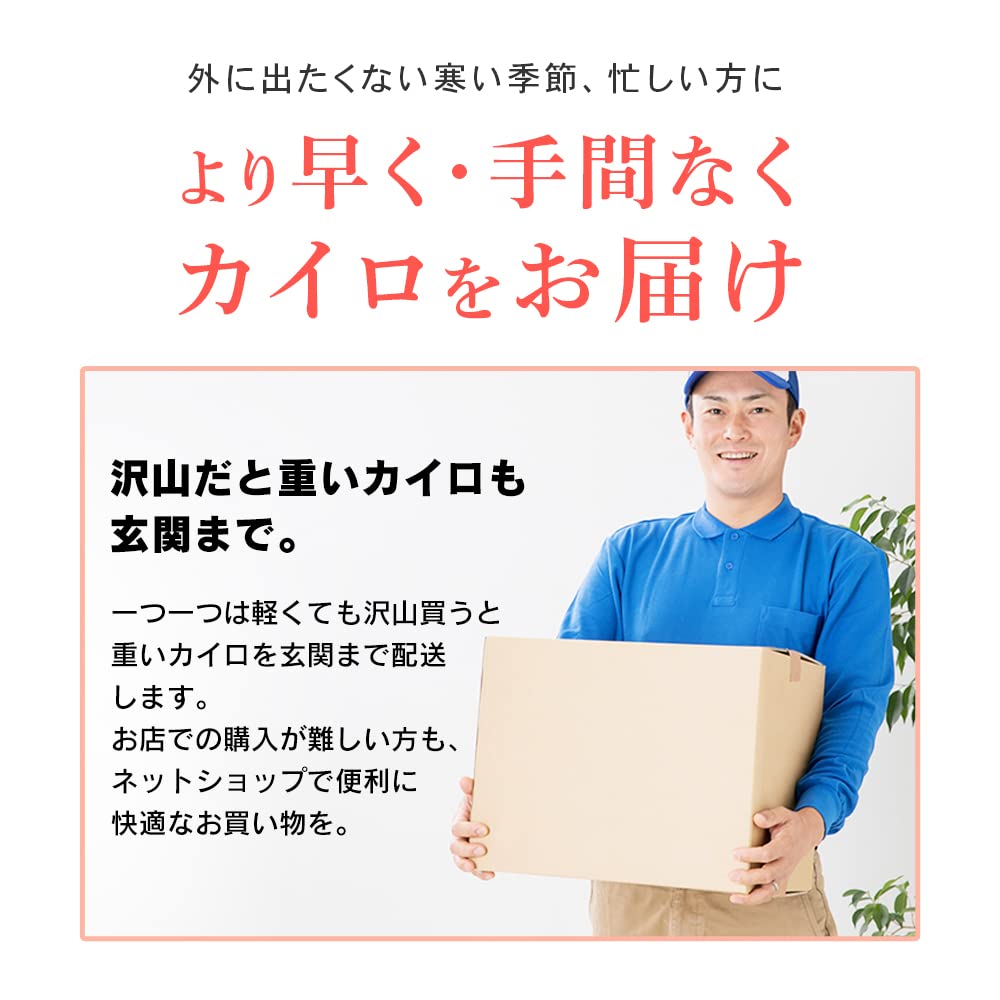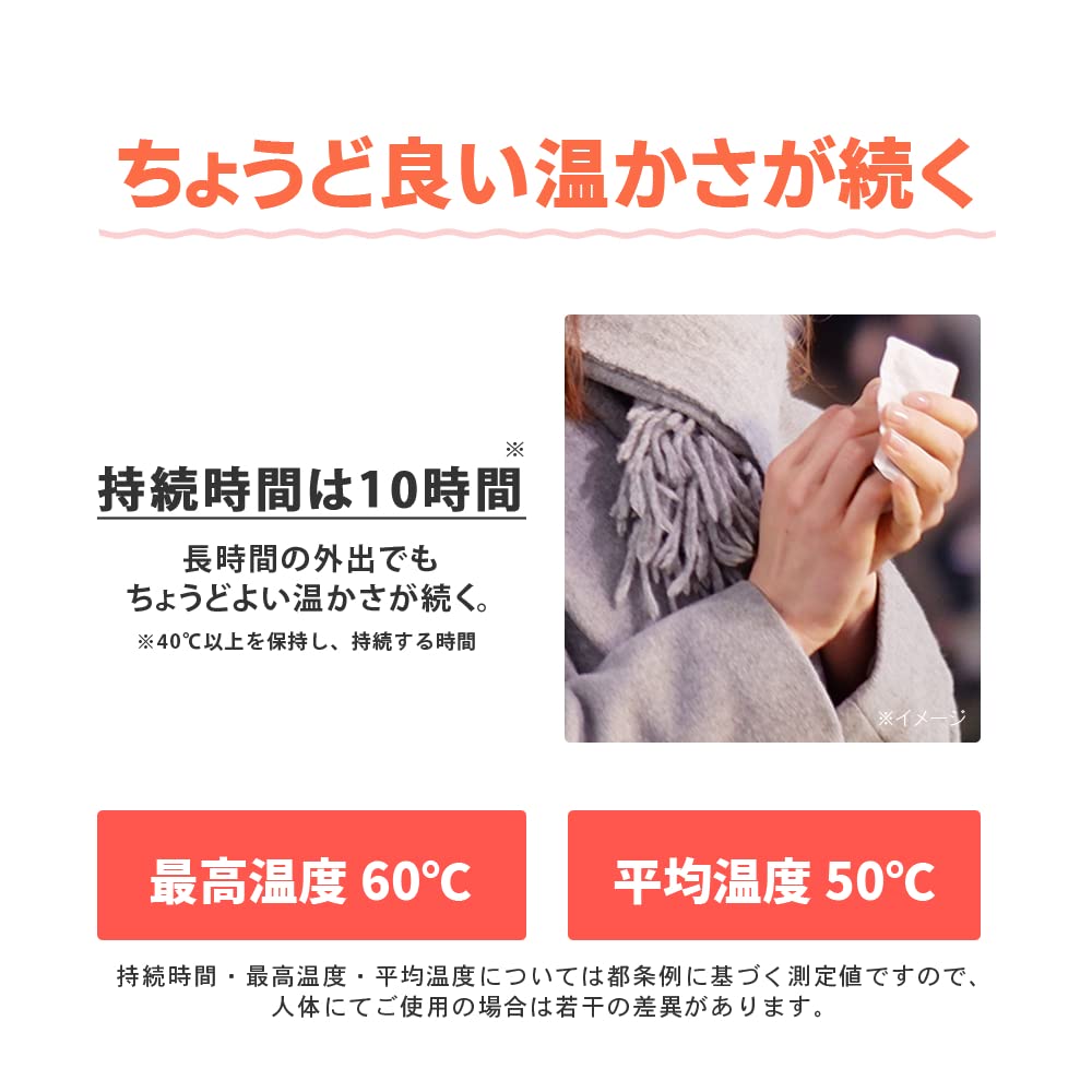 衣類になじみ、目立ちにくい色味の使い捨てカイロです。冬の寒い時期はもちろん、室内での冷房対策に。足腰の冷え、通勤通学、屋外作業、レジャー・スポーツ観戦にもお勧めです。最高温度:60℃、平均温度:50℃、持続時間:10時間※40℃以上を保持し、持続する時間