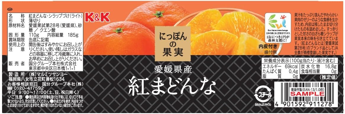 果汁をたっぷり含んだやわらかい果肉のゼリーのような食感を生かすため、内皮は残したまま切り分けたものを詰めました。すっきりとした甘さの白ざら糖シラップが果実本来の味を引き立てています。(紅まどんなとは「愛媛果試第28号」のブランド品としてJA全農が商標登録した果実です。※「K&K」とは:1712年創業の国分株式会社のオリジナルブランドです。1908年に商標登録されて以来、肉類や魚介類、野菜やフルーツなど、様々な缶詰製品を発売してきました。缶詰製品以外にも、パン粉や瓶詰製品、レトルトパウチ製品など豊富な商品を発売しています。