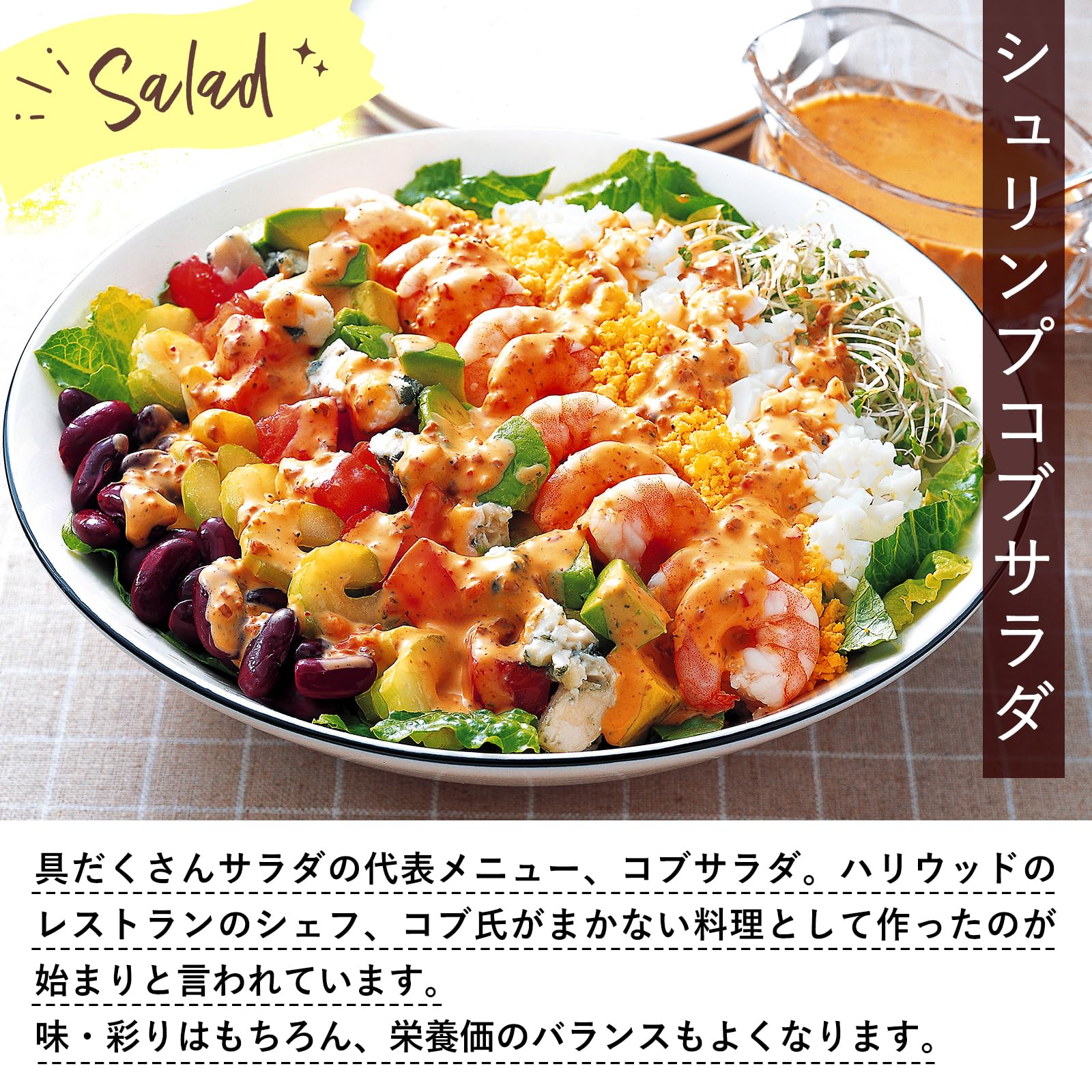女性にも人気の香辛料を使用した「コブサラダ」ドレッシングを、お好みの食材でぜひおたのしみください。