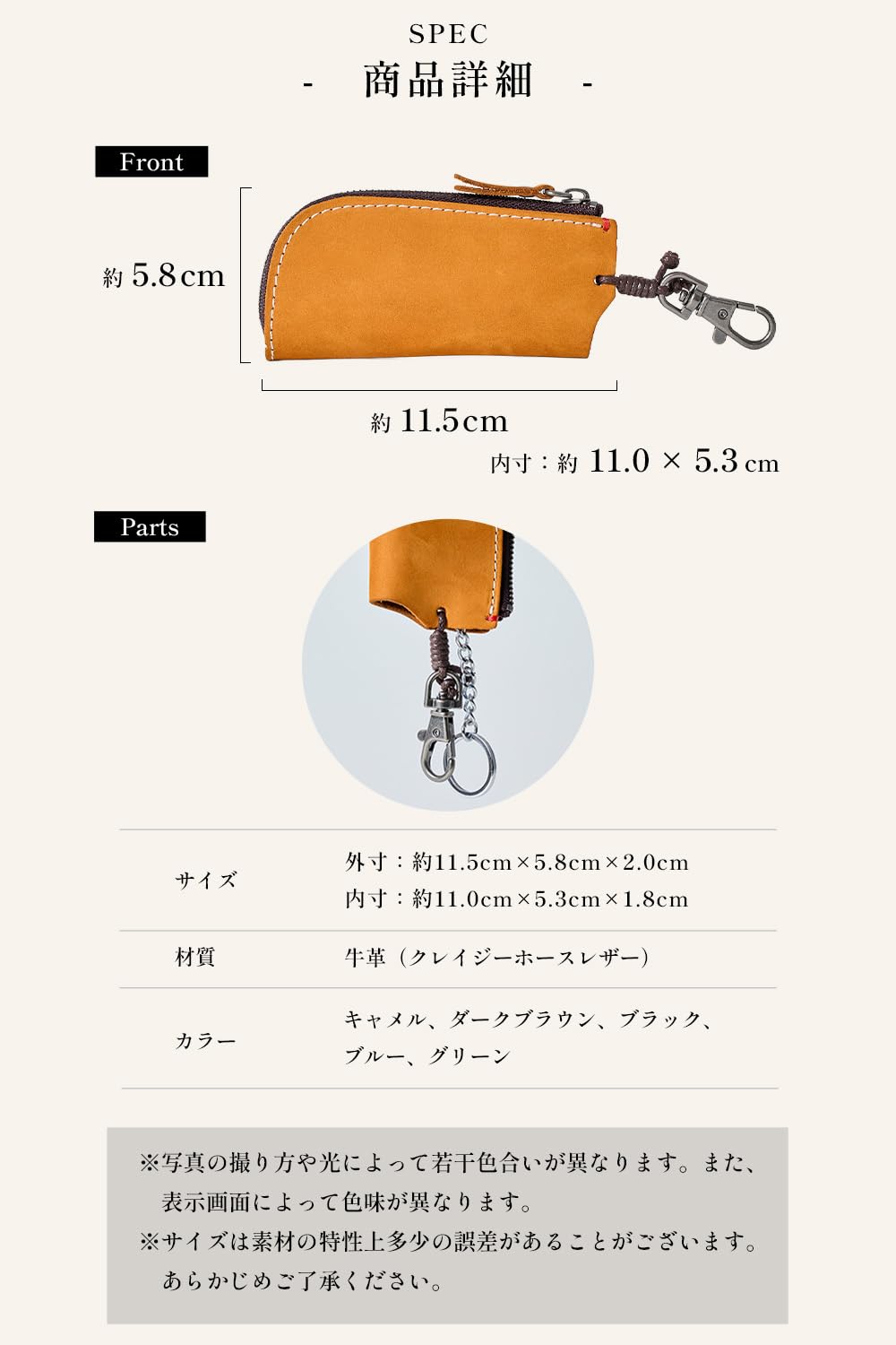 【本革クレイジーホースレザー】 牛革の最表面の皮を使用したキーケース。牛革の最表面の皮は繊維が細かく、頑丈で耐久性にすぐれています。本革の中でもクレイジーホースレザーと呼ばれる革を使用して作られています。クレイジーホースレザーは品質の良い牛の原皮(馬の皮ではありません)を使用し、植物性タンニンで鞣した皮でしっとりとしたやや起毛したような質感が特徴的なレザーです。当スマートキーケースは起毛加工技術を採用し作られており、手触りが滑らかで耐久性にも優れています。「思わず誰かに見せたくなる」そんな革製品を目指して作りました。