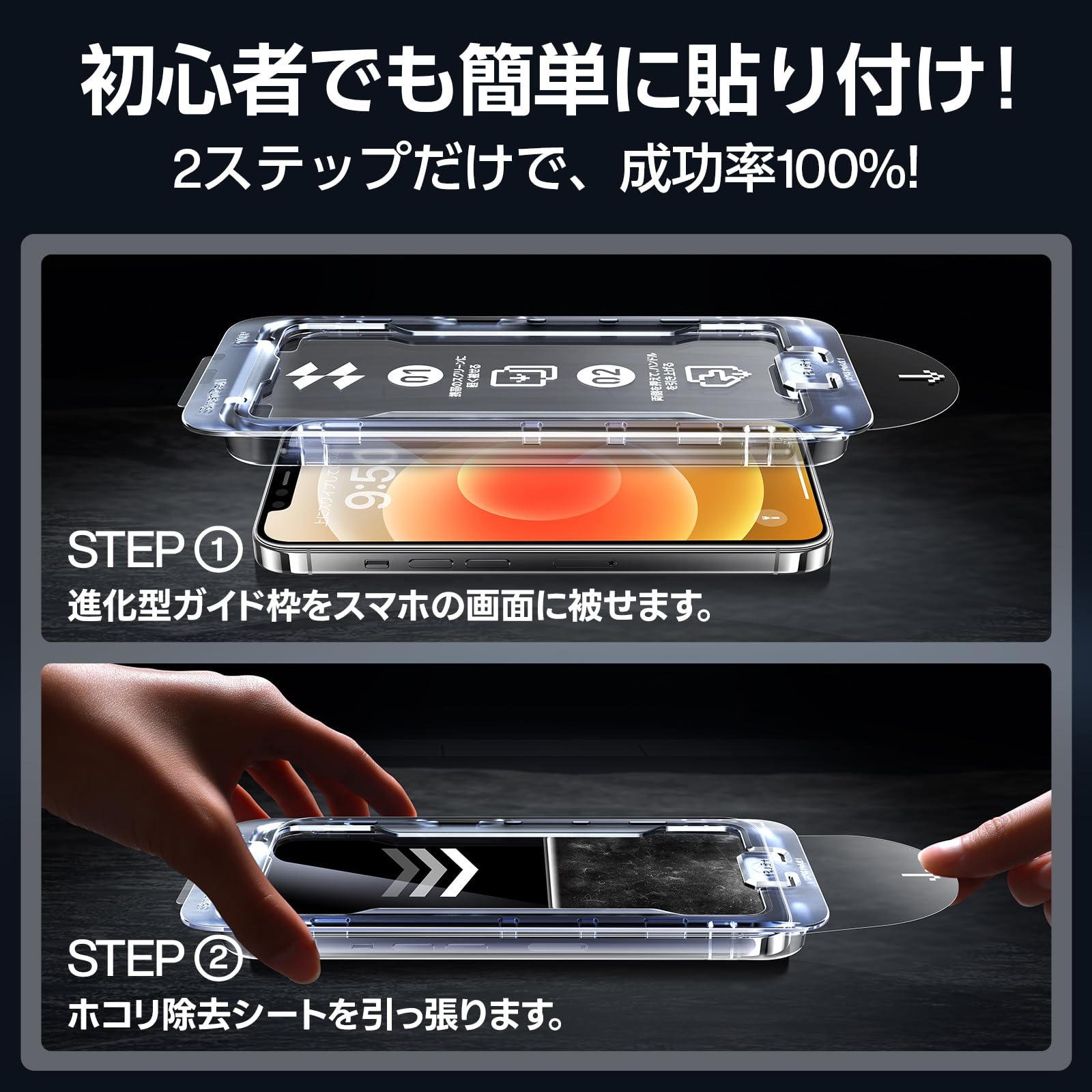 【革新的なガイド枠・異次元の貼りやすさ】2つのステップだけ、超簡単に貼り付けができます!ガイド枠でスマホの画面に被せて、ホコリ除去シートを引っ張ります!初心者でもズレなく、気泡レスのまま綺麗に貼れます。