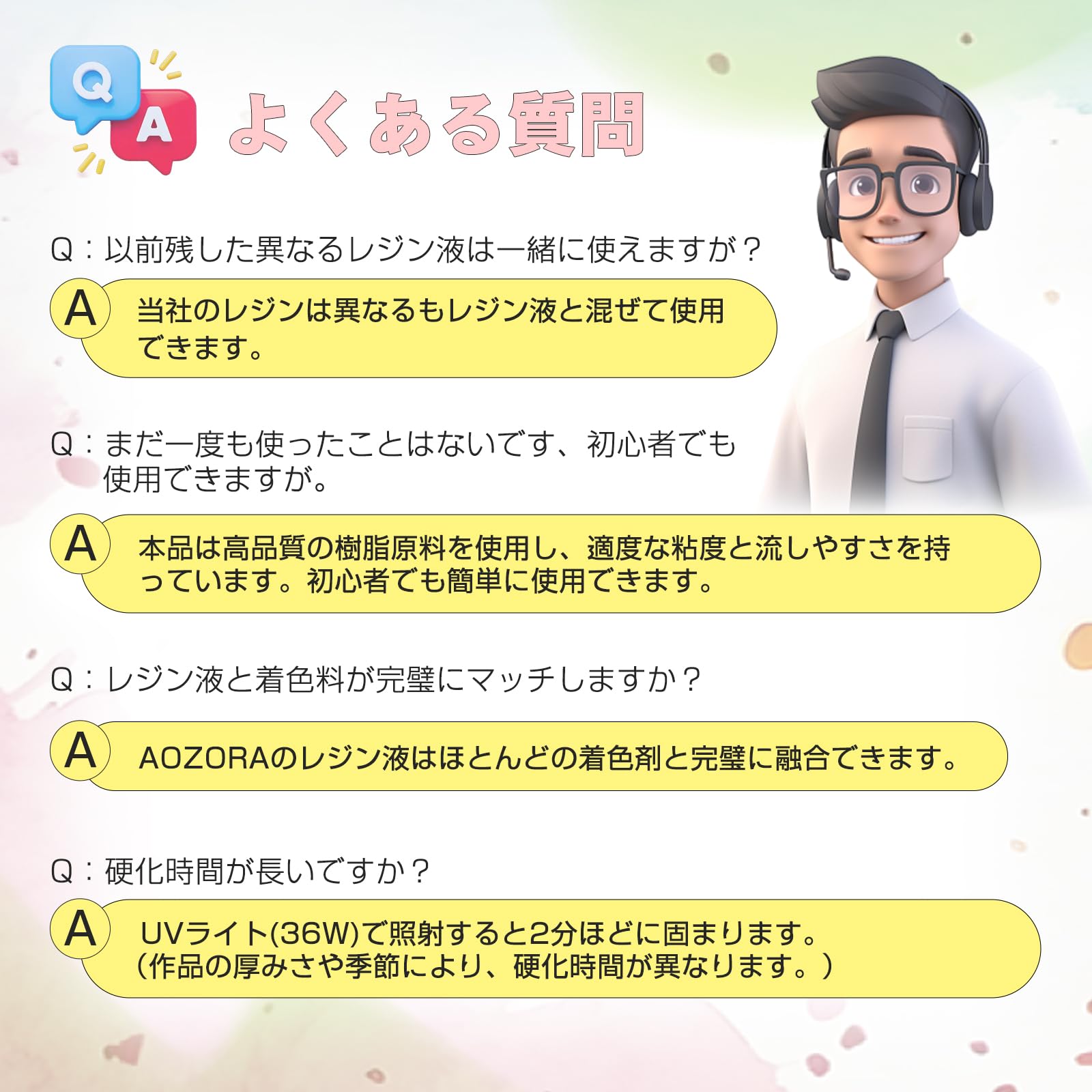 【プレミアムサービス】AOZORAのレジンは、10年以上の樹脂調製の経験を持つエンジニアのグループによって、無毒、無臭、VOCを含まず耐久性のある高品質の樹脂を使用しています。12ヶ月間の無料返品交換サービスを受けることができます。製品に不満がある場合は、いつでもお問い合わせください。最高品質のカスタマーサービスを提供します。