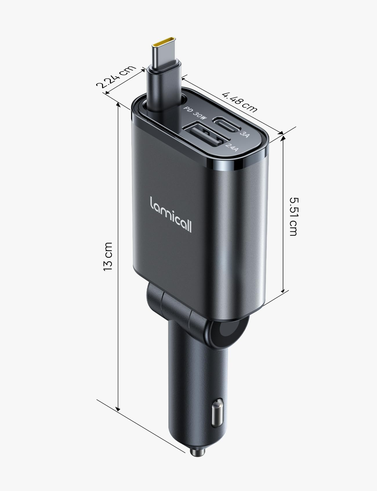 ??【日本語対応!一年間メーカー】巻取りケーブル:75cm 。対応車種:DC12V/24V車。サイズ:13cmx2.24cmx4.48cm、重さ:82g。??出力:巻き取りType-Cケーブル:30W(PD 5V/3A、9V/3A、12V/2.5A)、USB-A:12W(5V/2.4A)、USB-C:15W(5V/3A)。??ご購入した日より一年間メーカーサービスを提供いたします。万が一初期不良が発生した場合は、連絡先:アカウントサービス内の「アカウントサービス」→「注文履歴」→「LomicallDirect」→「質問する」或いは説明書に記載されている他の連絡先に、お問合せ下さい。