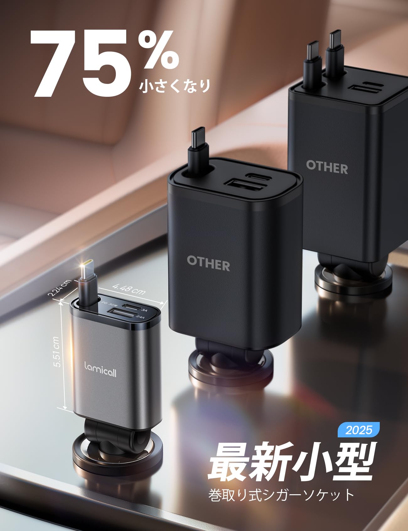 ??【手のひらサイズ】2025年最新式手のひらサイズ(13cm×2.24cm×4.48cm)の巻き取り式シガーソケットは、トレンドカラーを採用し、車内のインテリアと完璧に調和します。その高級感あふれるデザインは、欧州車やSUVや小型車にも違和感ないし、収納が便利ですっきりと整えます。もともと狭い車内空間を最大限に活用しましょう。