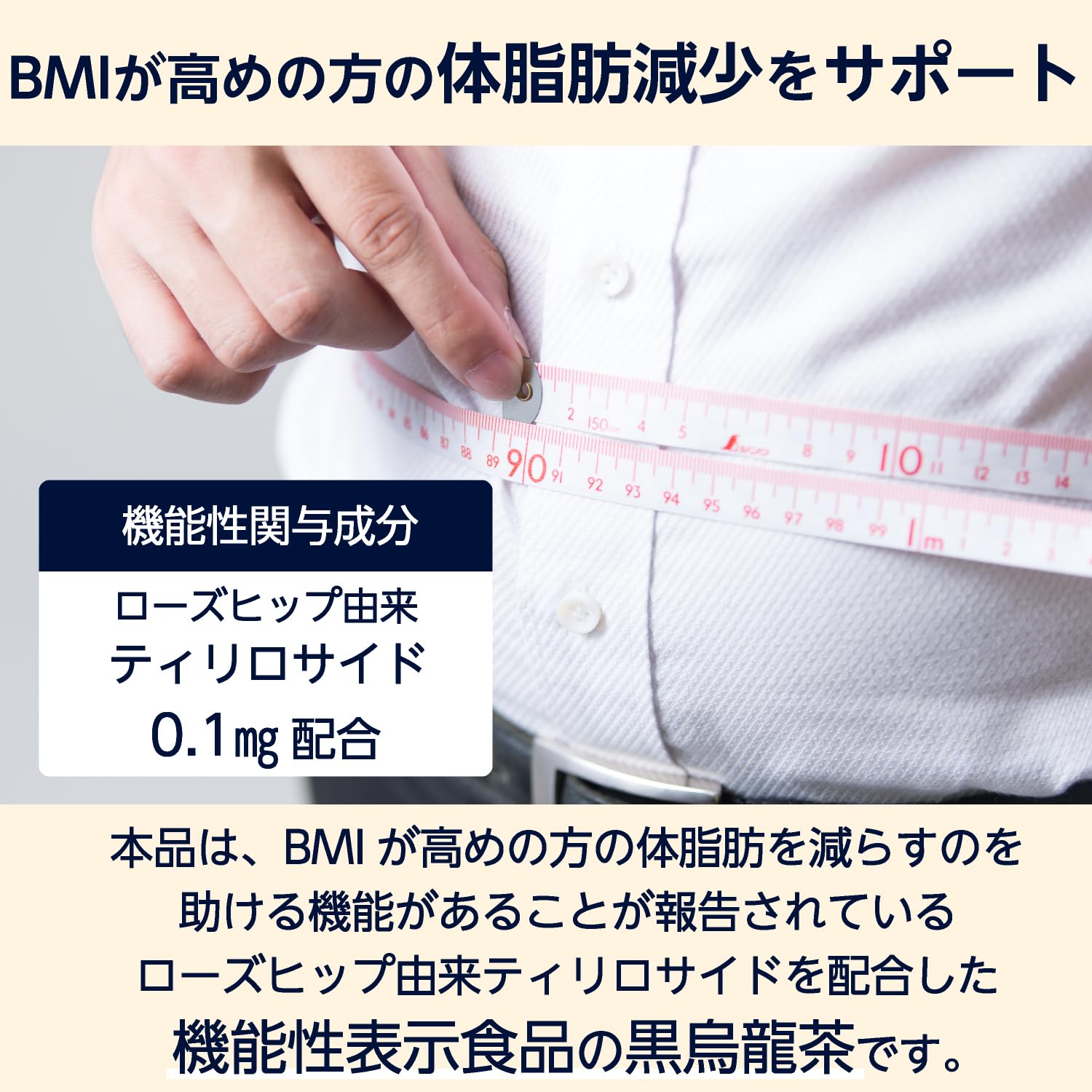 機能性表示食品黒烏龍茶です。 BMIが高めの方の方だについた脂肪を減らします。 ローズヒップ由来ティリロサイド配合です。