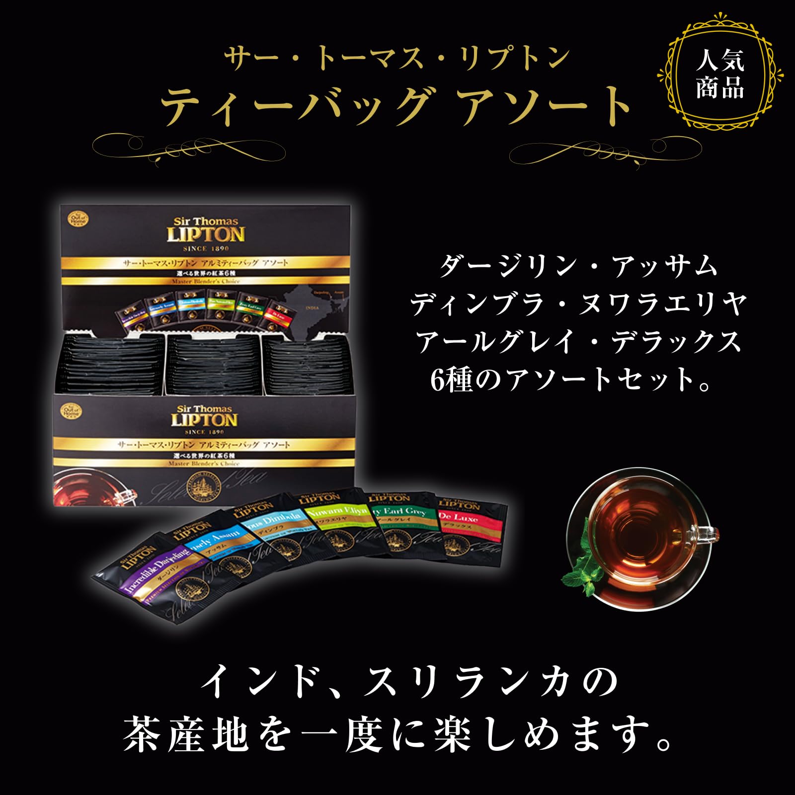 【紅茶の専門家「リプトン」のプレミアムシリーズ】世界中の高名な産地から厳選された茶葉のみを使用する「サー・トーマス・リプトン」から、6種類×10袋(計60袋)のアソートセットが登場。