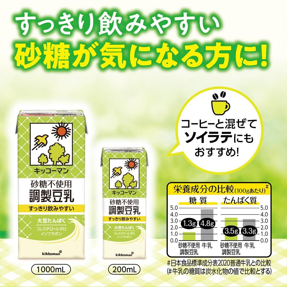 開けやすく、ストックしやすいSOYMILKDAYS!キッコーマンの豆乳は品質と鮮度にこだわり、大豆の微量栄養成分をより多く抽出し大豆臭の少ない、おいしい味に仕上げています。飲料各カテゴリでトレンドの「砂糖不使用」! 無調整とは異なる、“調製豆乳らしい 風味の豆乳です。すっきりとしていて、ほのかな甘みを感じるおいしさです。