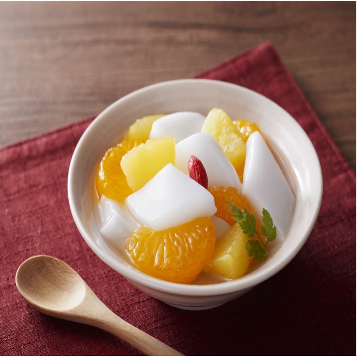 もちぷる食感の杏仁豆腐に色鮮やかなゴールデンパインとみかんを加えました。そのままでも、炭酸で割ってもお楽しみいただけます。