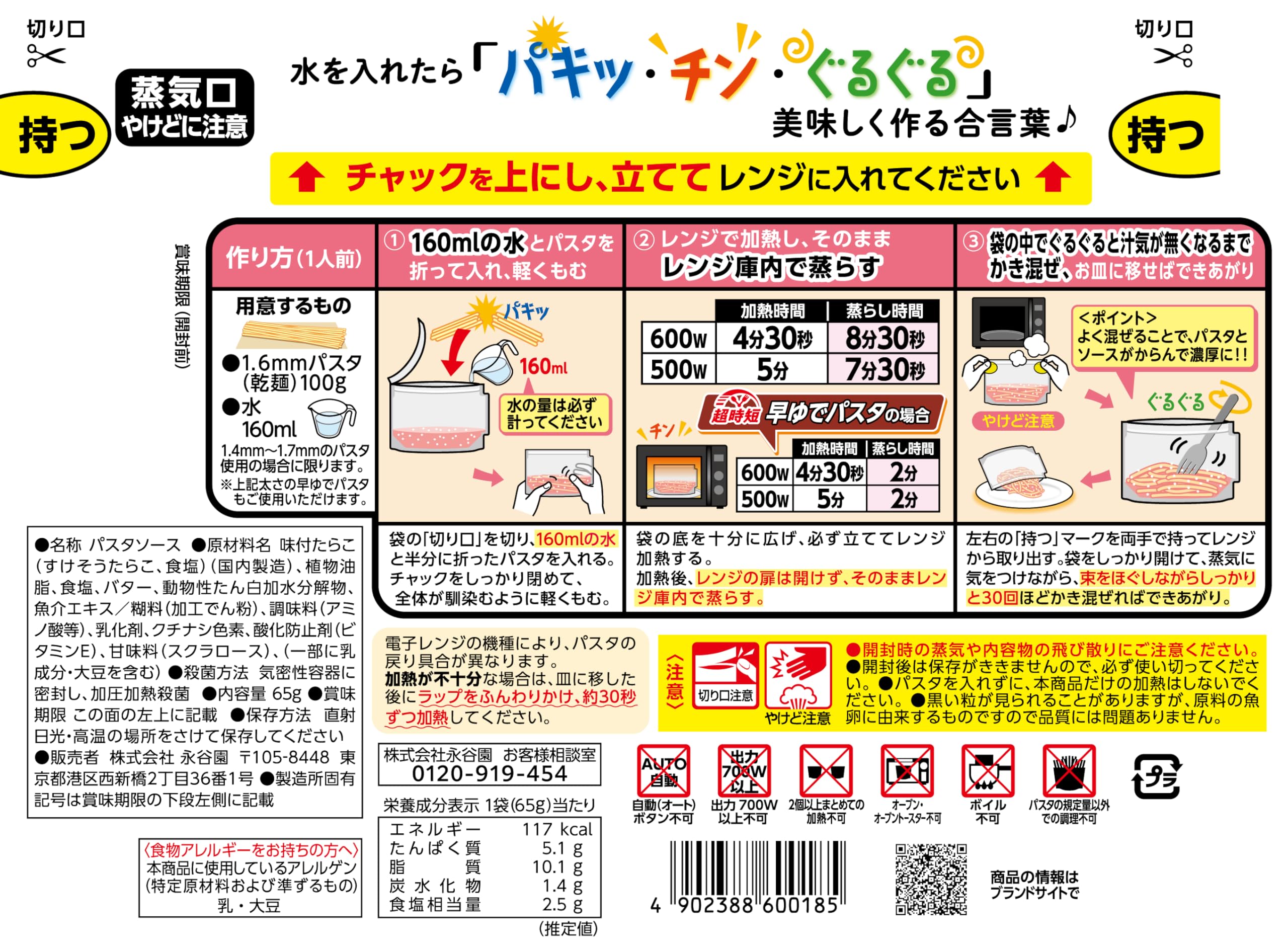 麺と水を用意したら、レンジだけで作れる調理パウチ付きのパスタソースです。お好みに合わせて1.4mm〜1.7mmのパスタが使用できます。早ゆでパスタでも作れます(蒸らし時間不要)。【ボロネーゼ】じっくり煮込んだ挽肉の旨味と、チーズのコク深い味わいが特徴のボロネーゼは、麺とソースがしっかりからんだ、お店のように濃厚な味わいに仕上がります。 【カルボナーラ】3種のチーズと卵黄の濃厚な味わいが特徴のカルボナーラは、麺とソースがしっかりからんだ、お店のように濃厚な味わいに仕上がります。 【ペペロンチーノ】ブラックオリーブの旨味とガーリックの香りが特徴のペペロンチーノは、麺とソースがしっかりからんだ、お店のように濃厚な味わいに仕上がります。 【たらこ】たらこを贅沢に使用した、バターのコクも豊かで濃厚な味わいです。 【ジェノベーゼ】爽やかなバジルの香りと、ゴーダチーズの風味をベースに、パルミジャーノ・レッジャーノとペコリーノ・ロマーノをブレンドした芳醇なチーズの濃厚な味わいが楽しめます。【ボンゴレビアンコ】アサリの旨味たっぷりのスープにバターの風味をきかせ、濃厚で後引く味わいに仕上げました。パキットならではの、ゆで汁で「乳化」させたソースの濃厚さが引き立つ、オイル系メニューです。