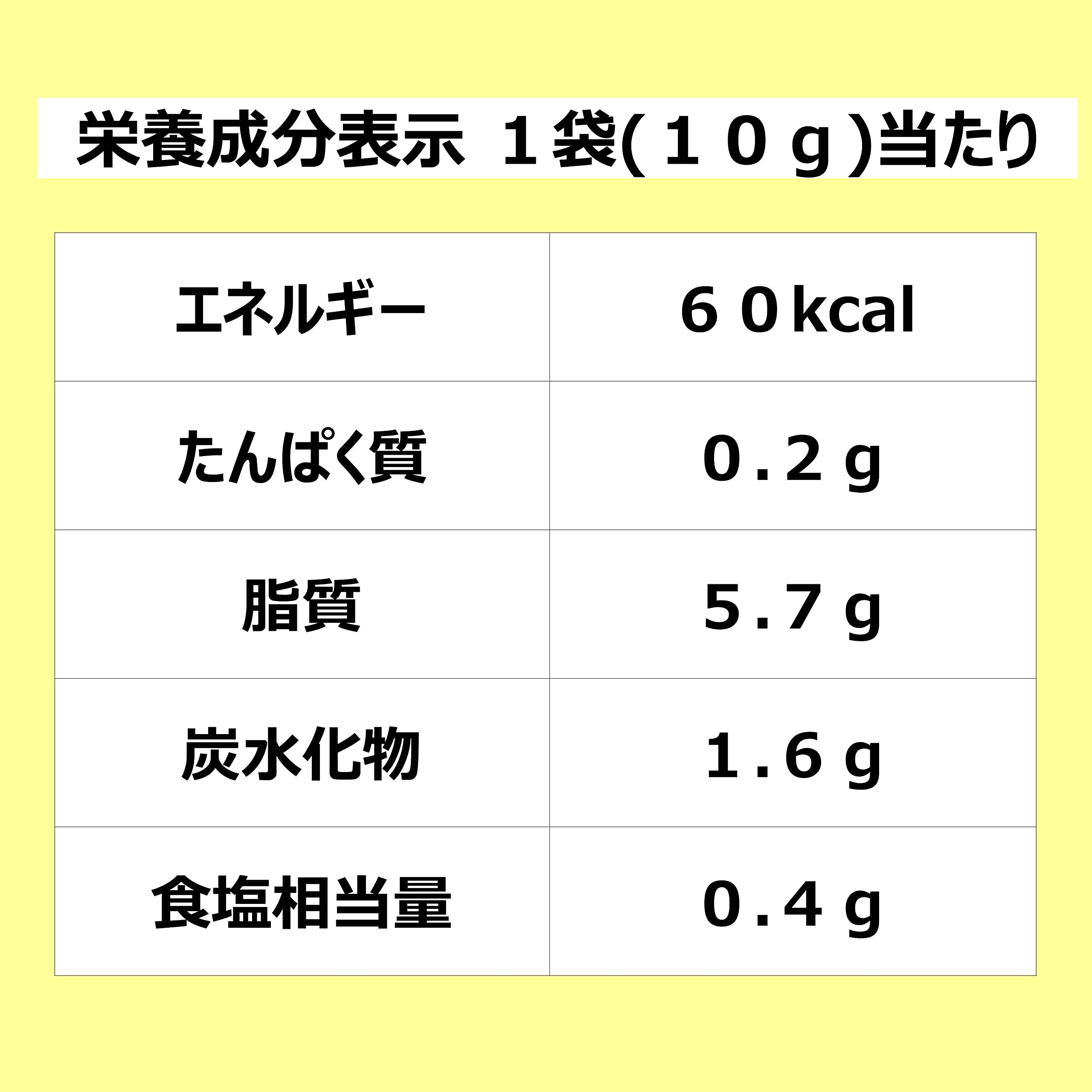●栄養成分/(1袋10g当たり)エネルギー60kcal、たんぱく質0.2g、脂質5.7g、炭水化物1.6g、ナトリウム136mg、リン9mg、カリウム4mg、食塩相当量0.4g